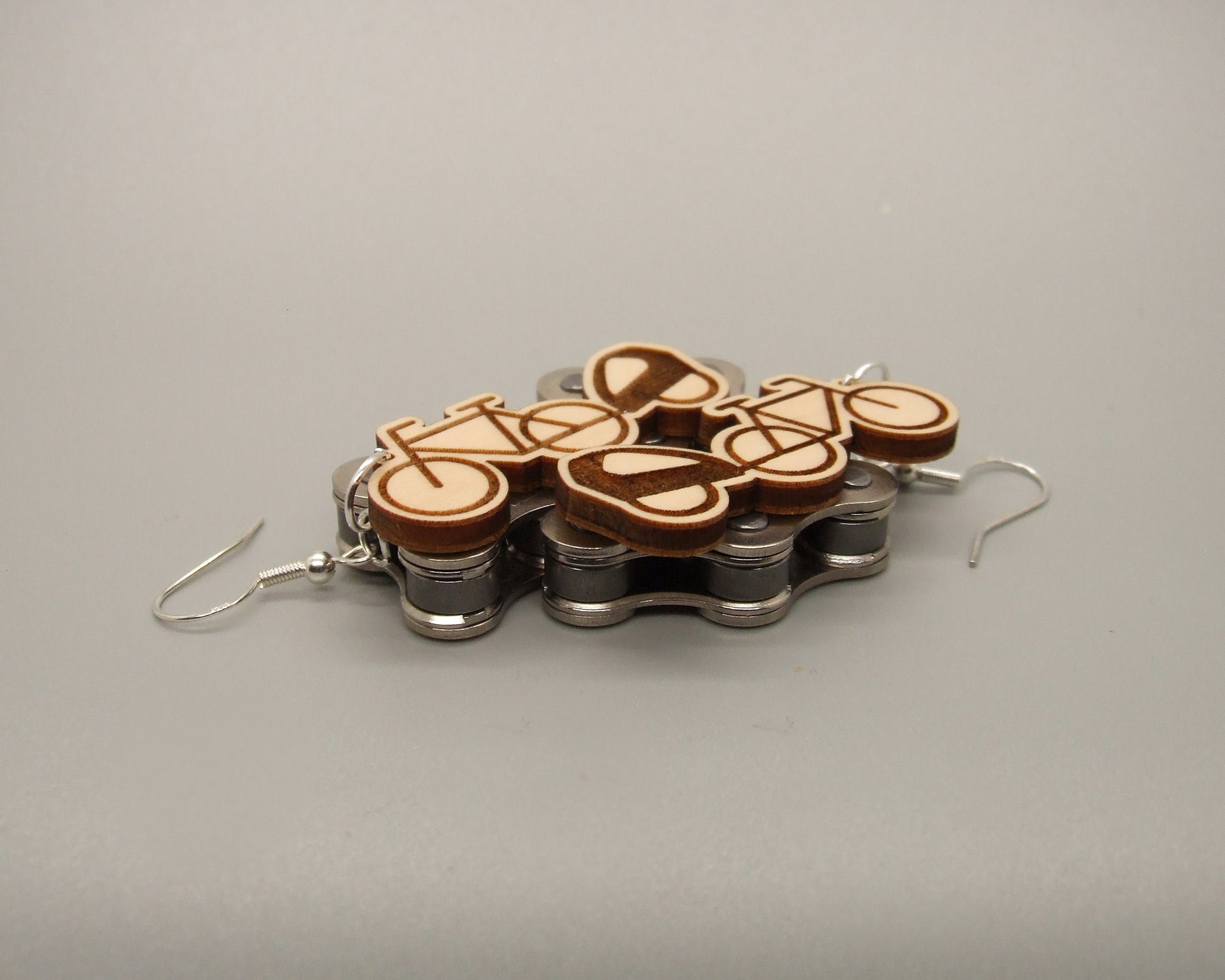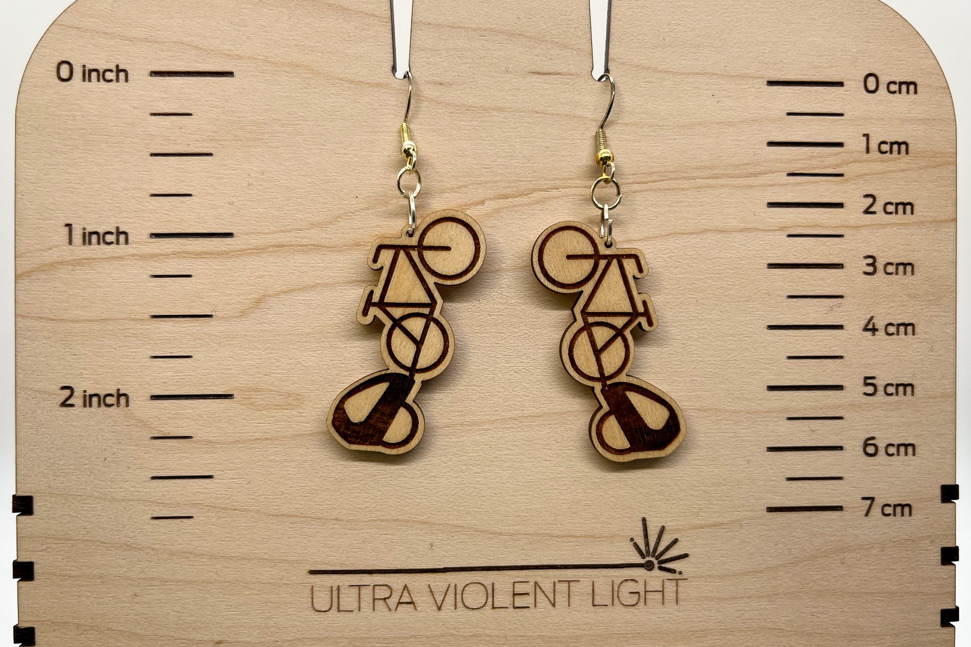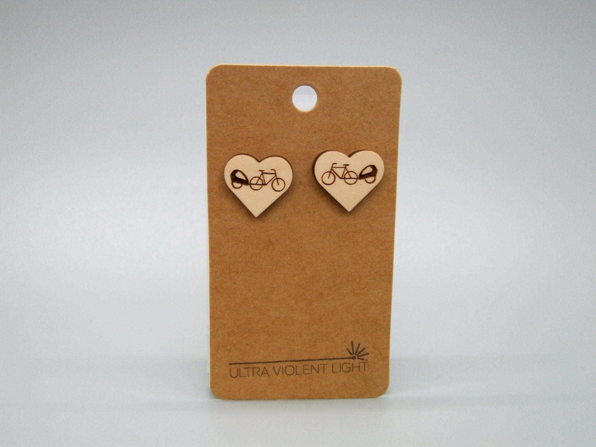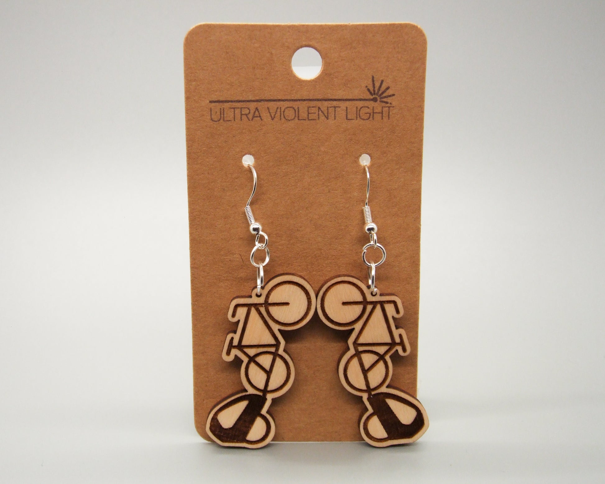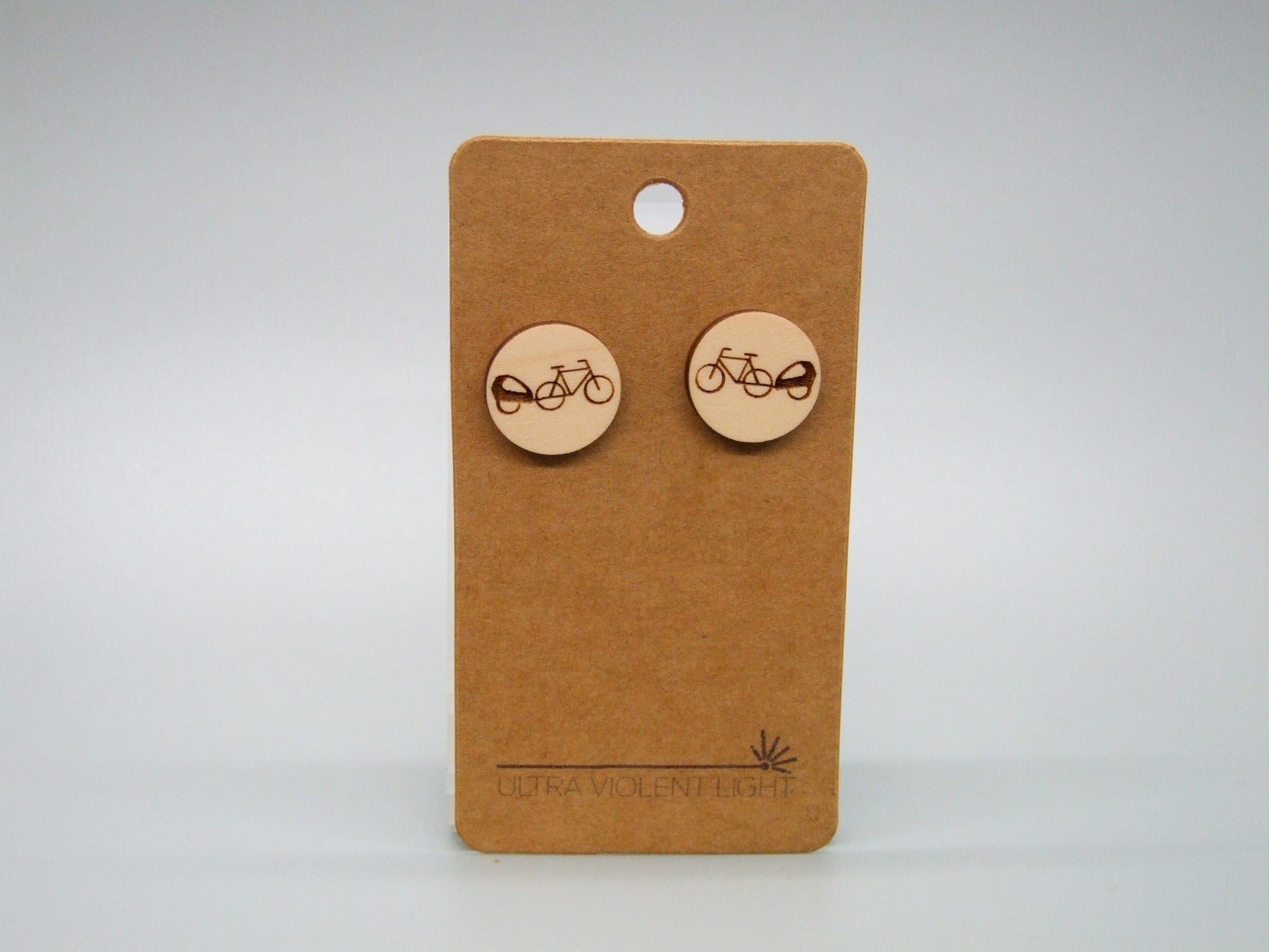 A bicycle with a trailer is laser engraved on finished maple plywood. Choose from hook or post earrings.