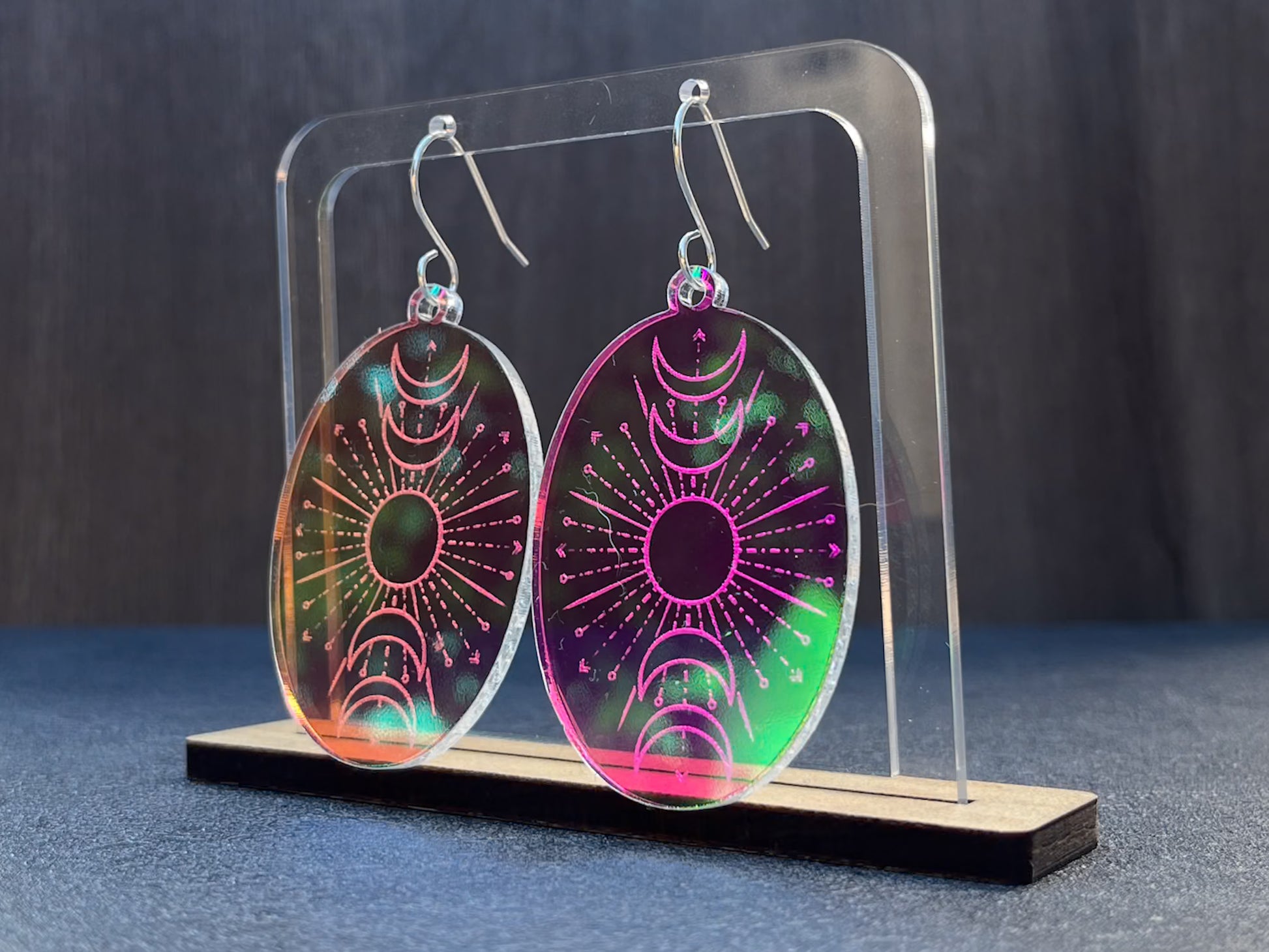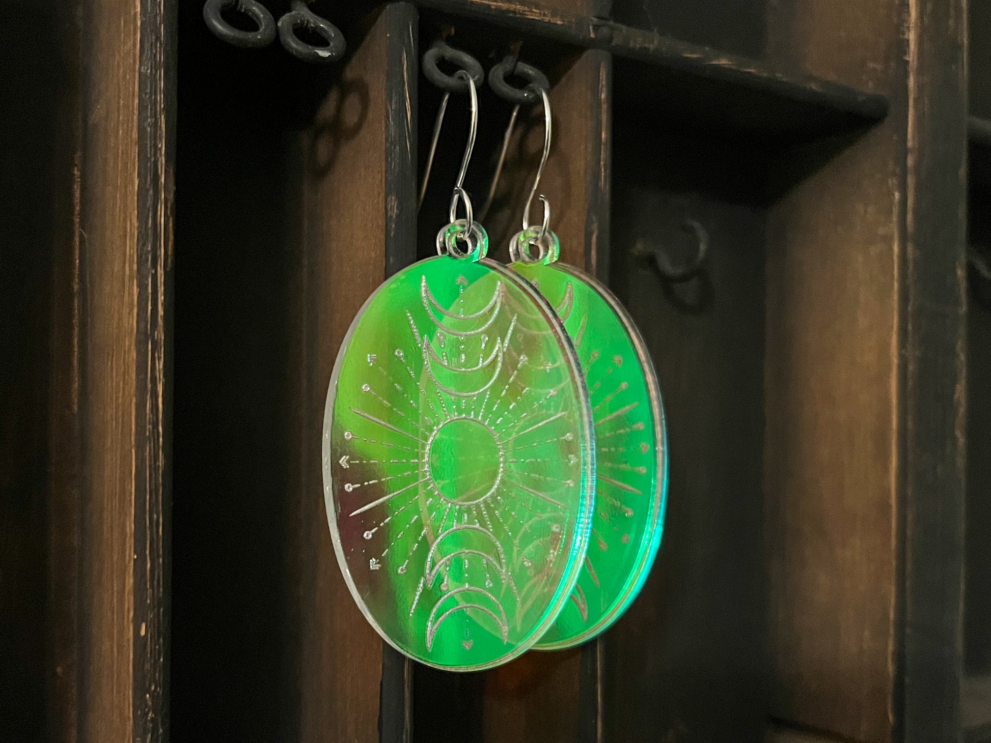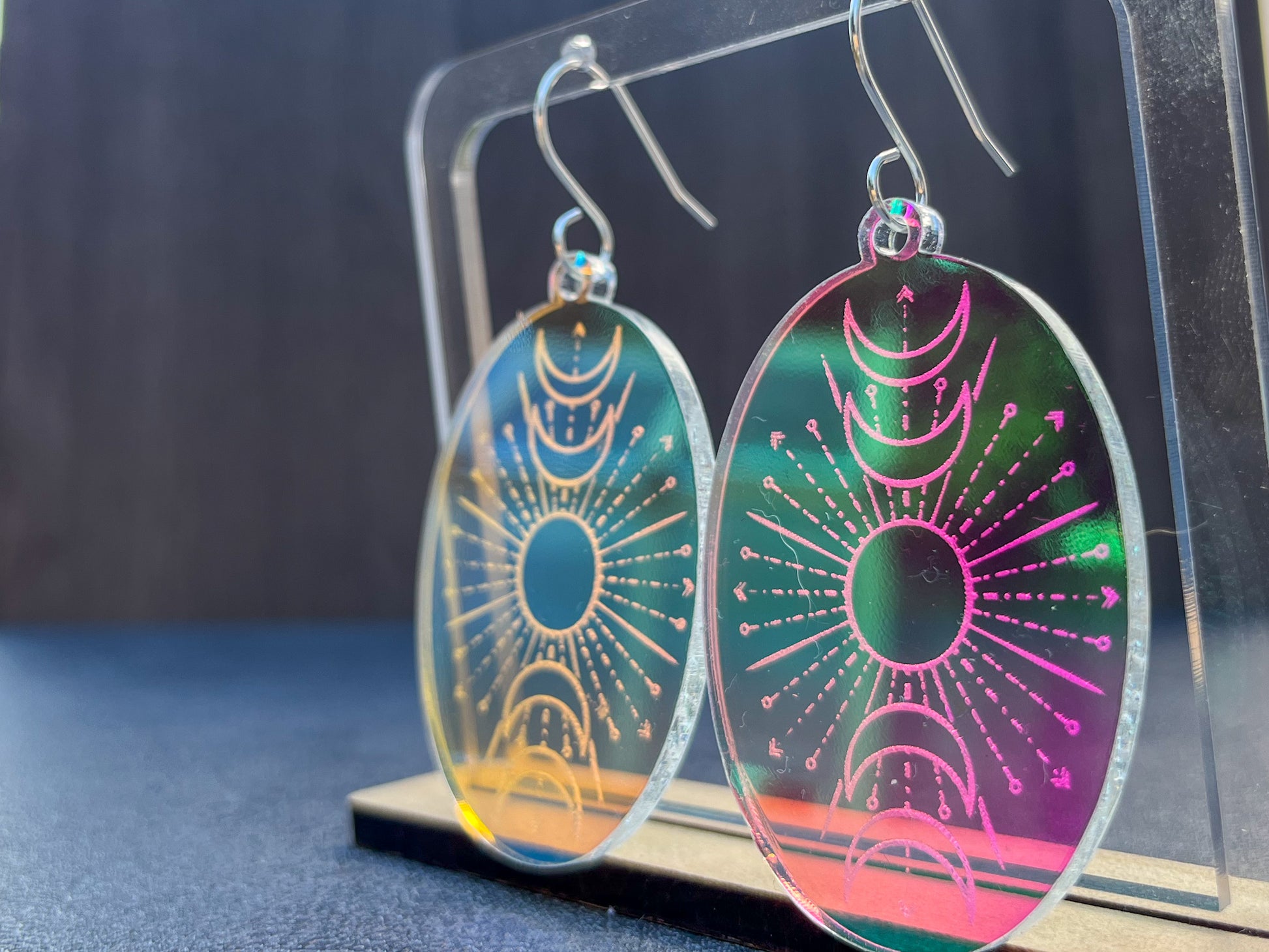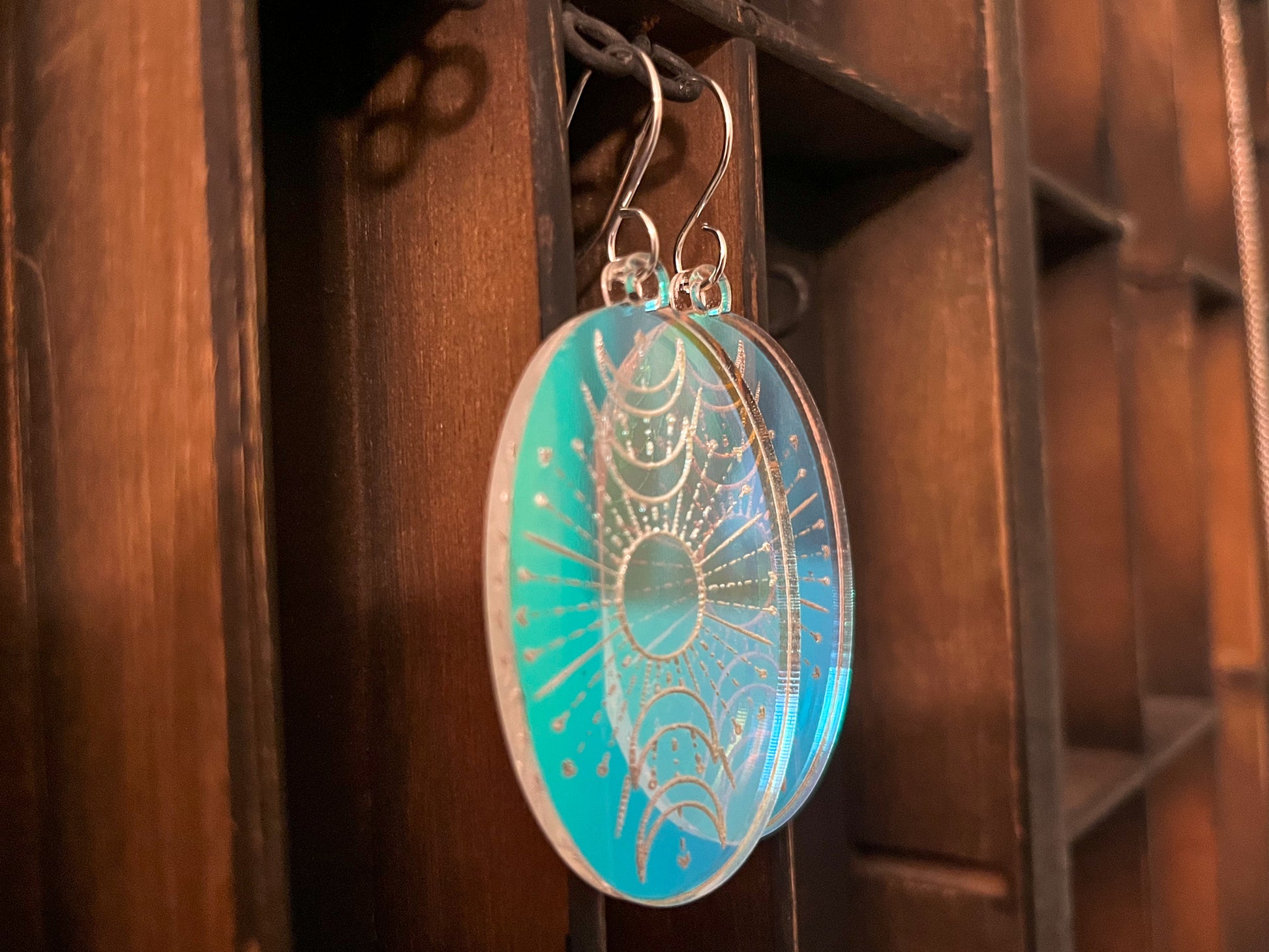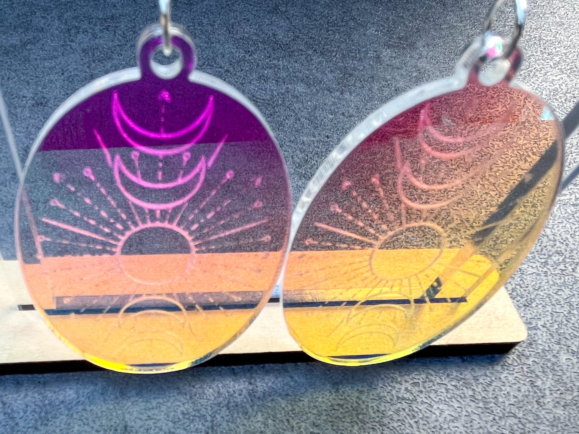 These earrings are made of sunset iridescent acrylic. They are attached to surgical steel hooks, great for sensitive ears.