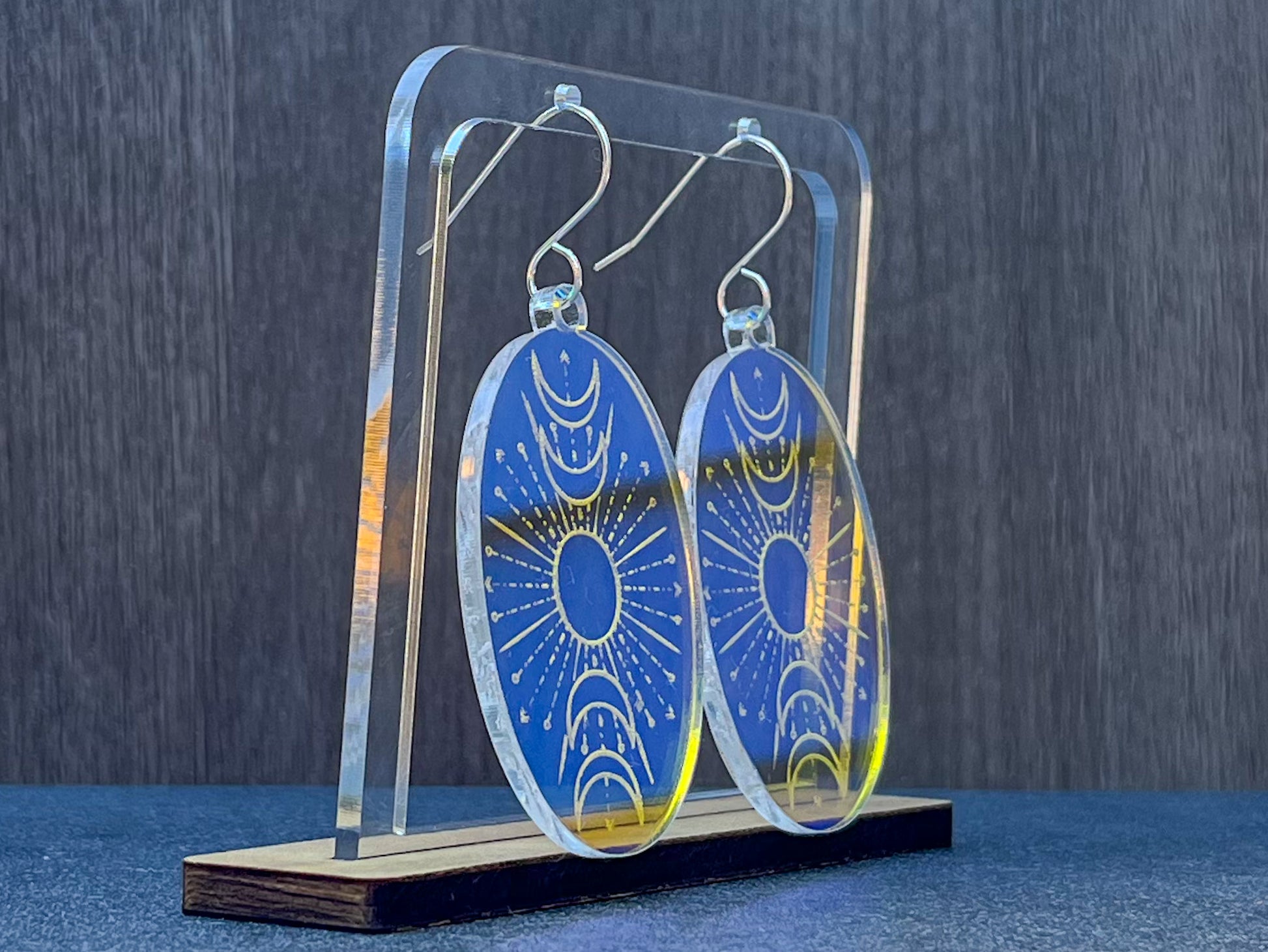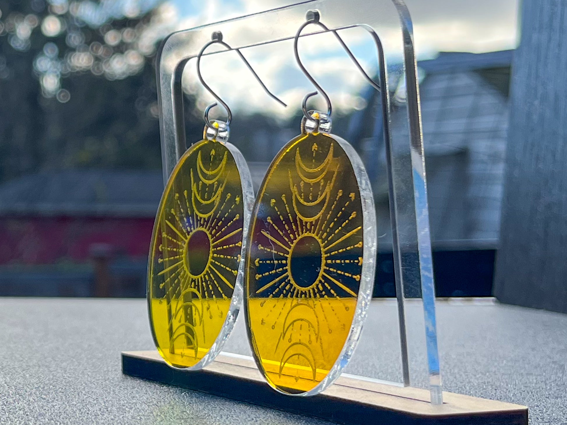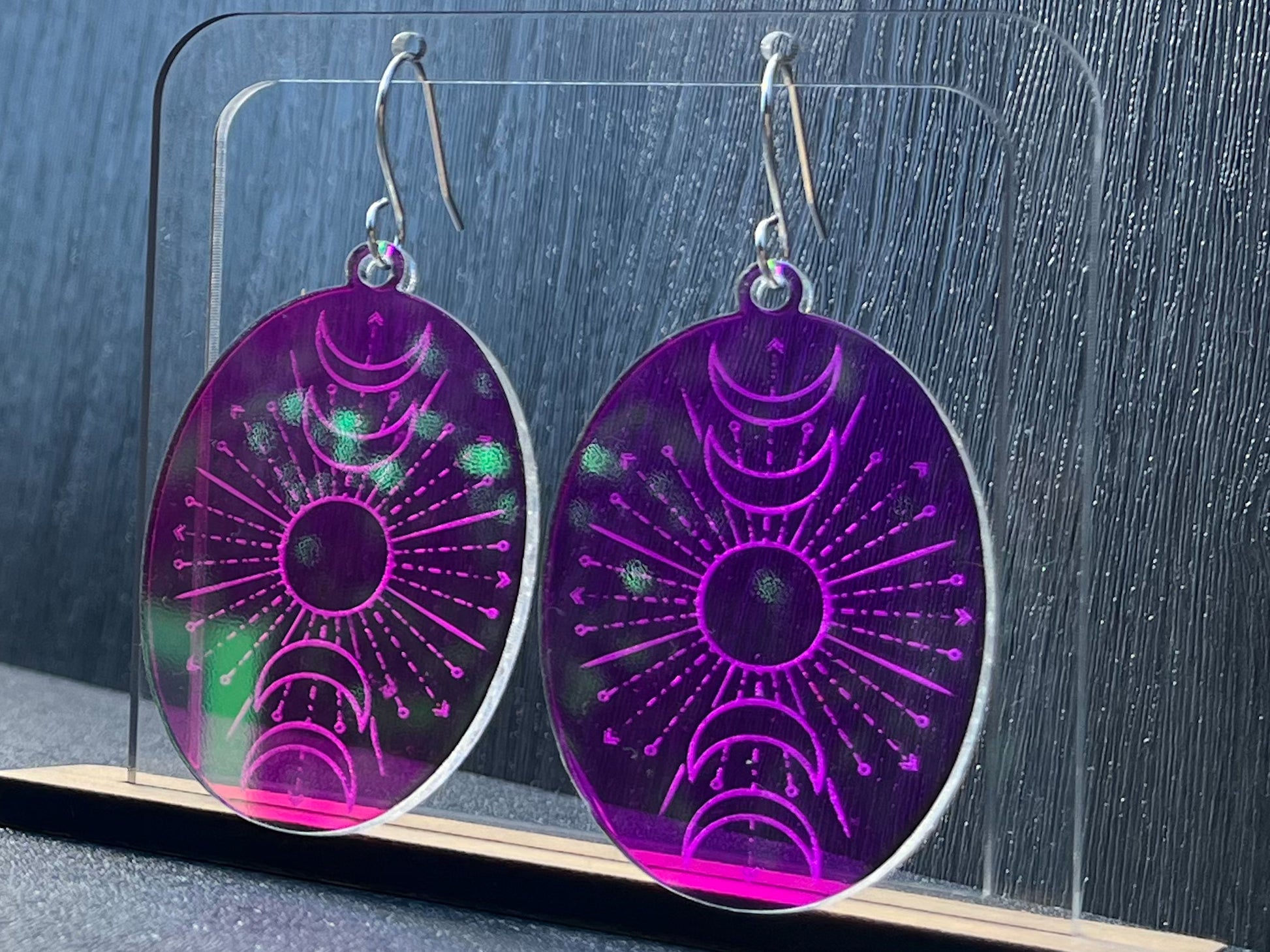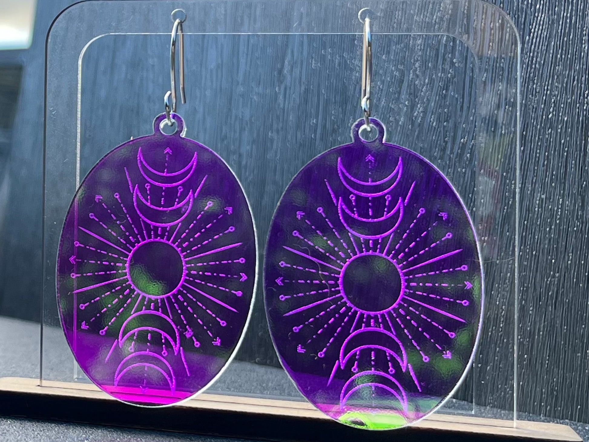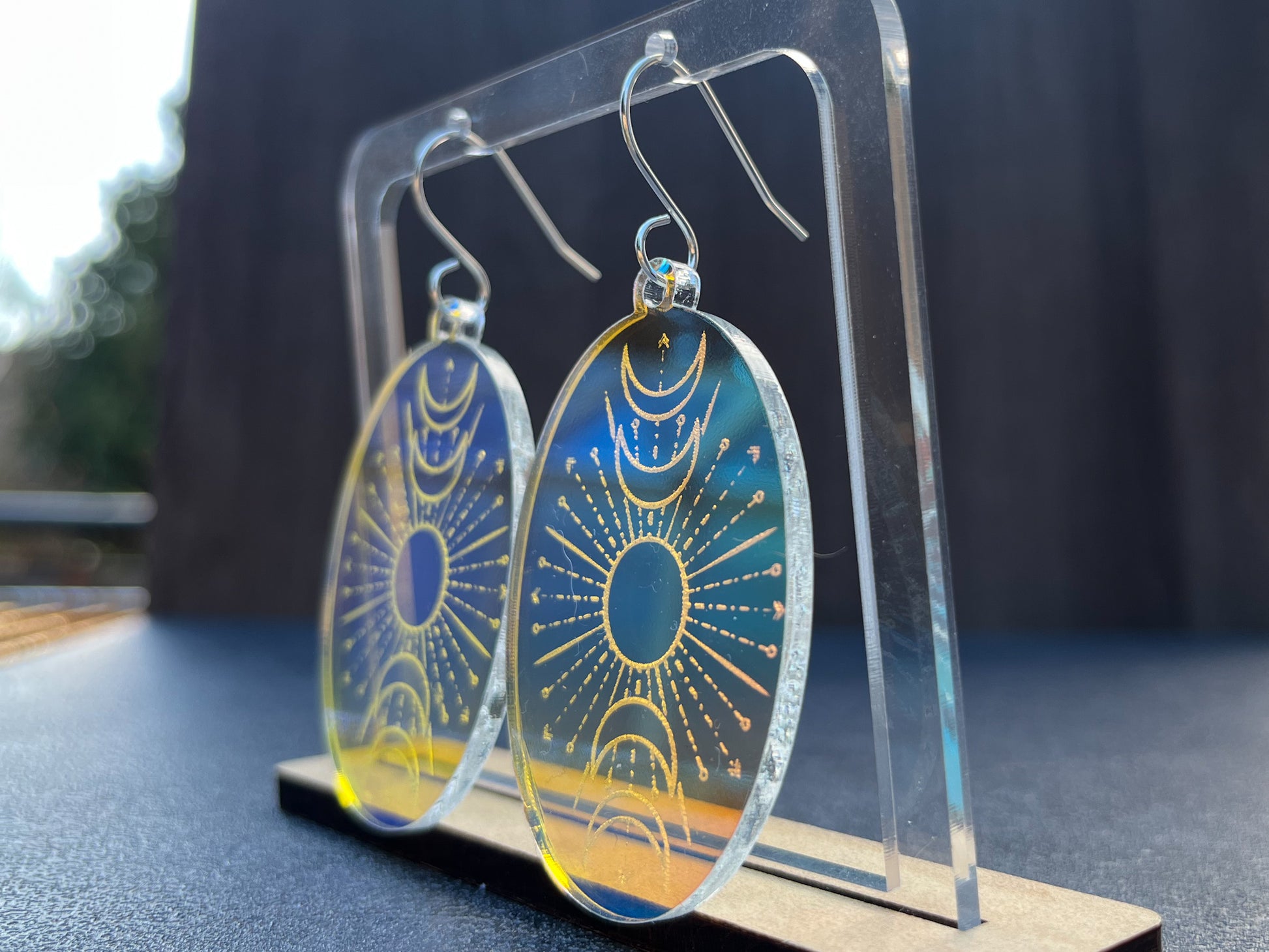 These earrings are made of sunset iridescent acrylic. They are attached to surgical steel hooks, great for sensitive ears.