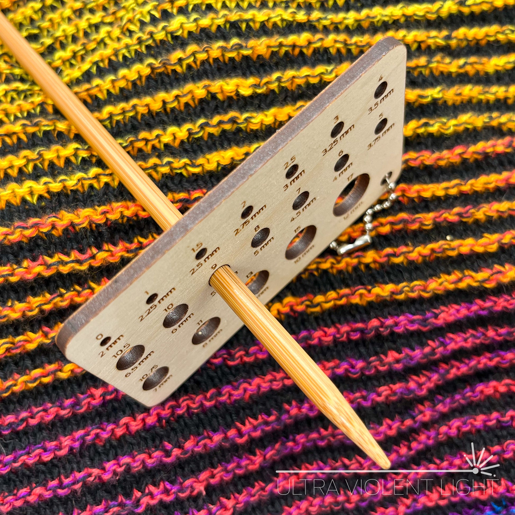 This sizer will measure your knitting needles from US size 0 to 17 and metric sizes from 2-12mm.