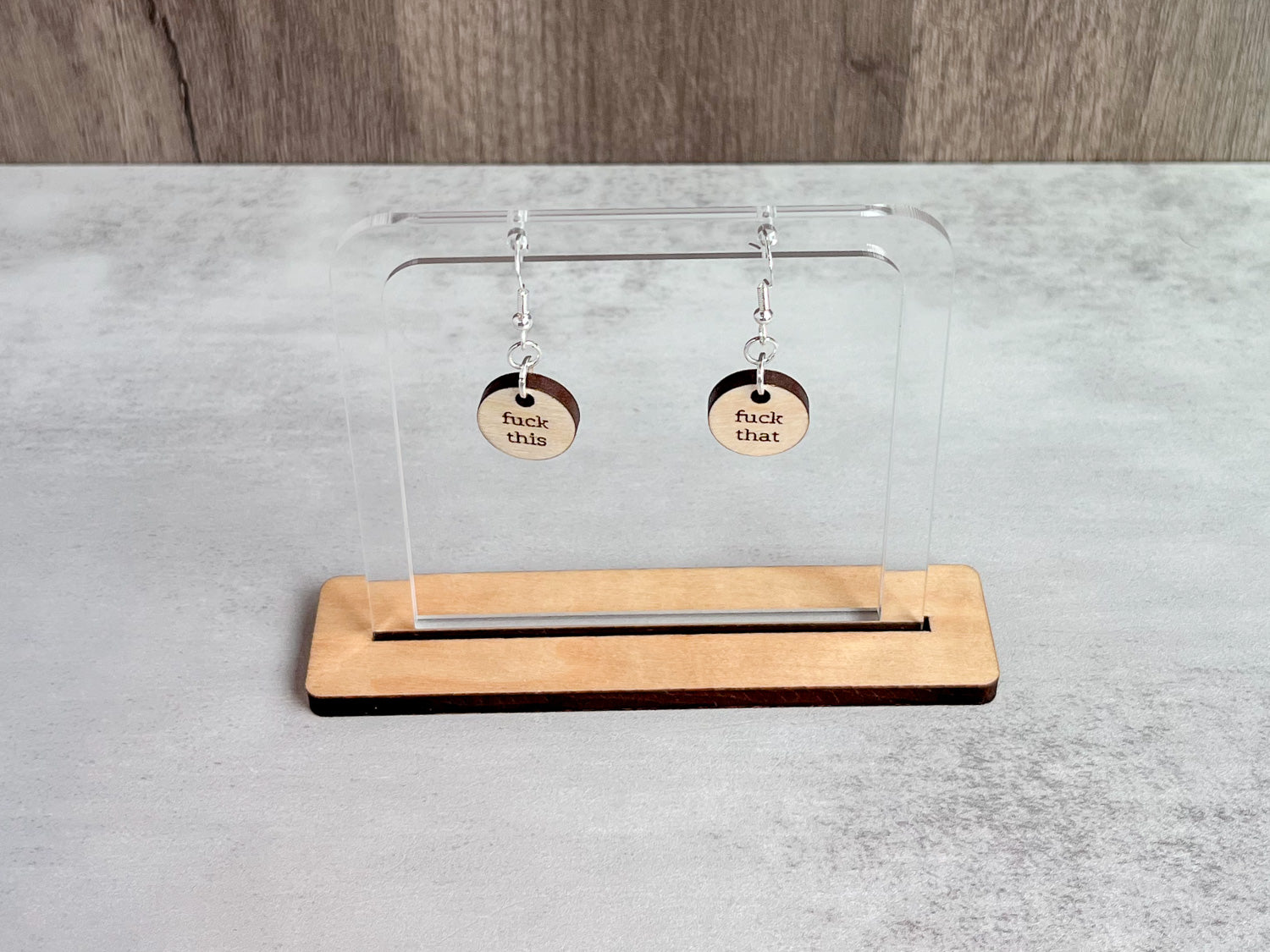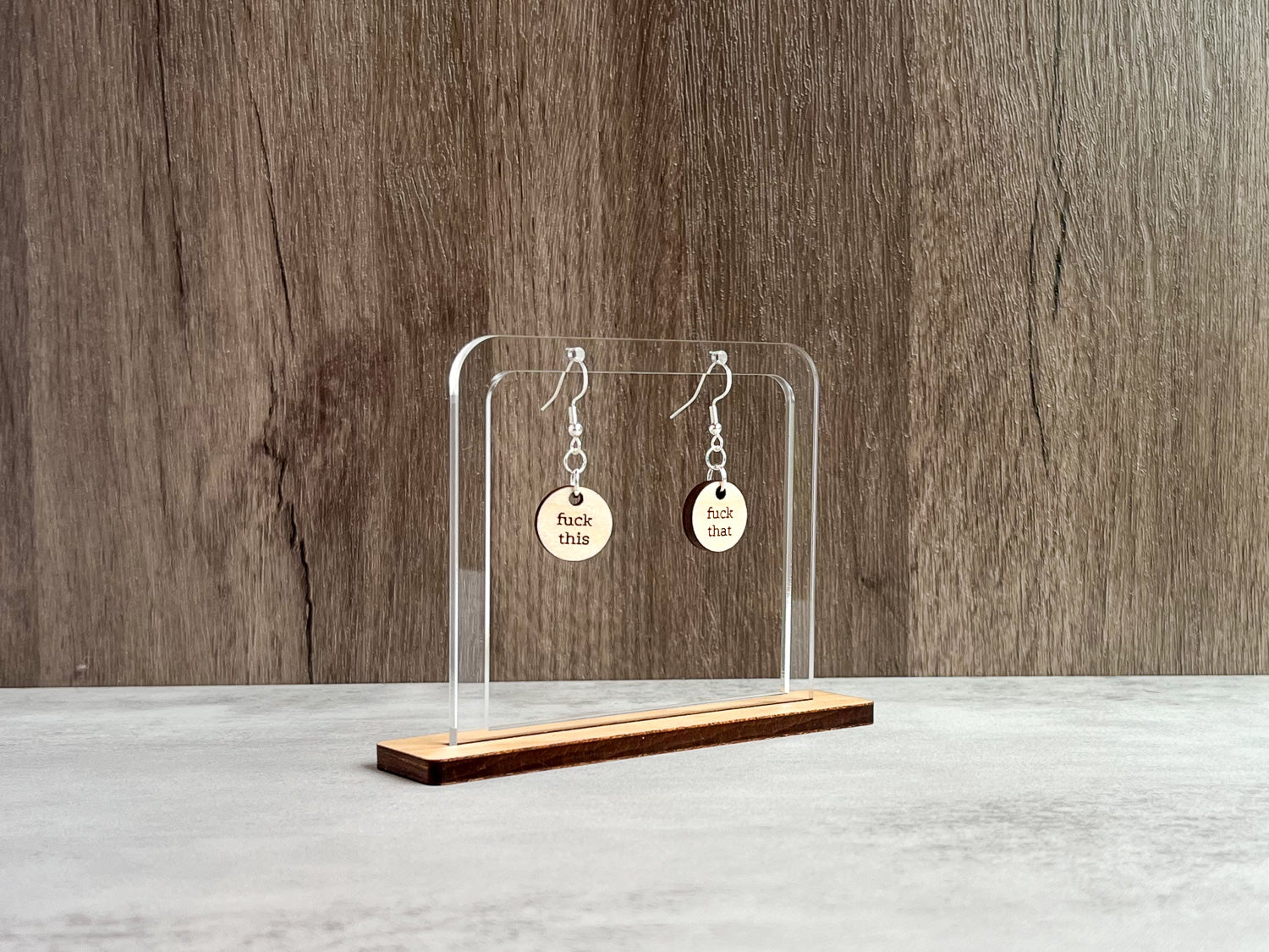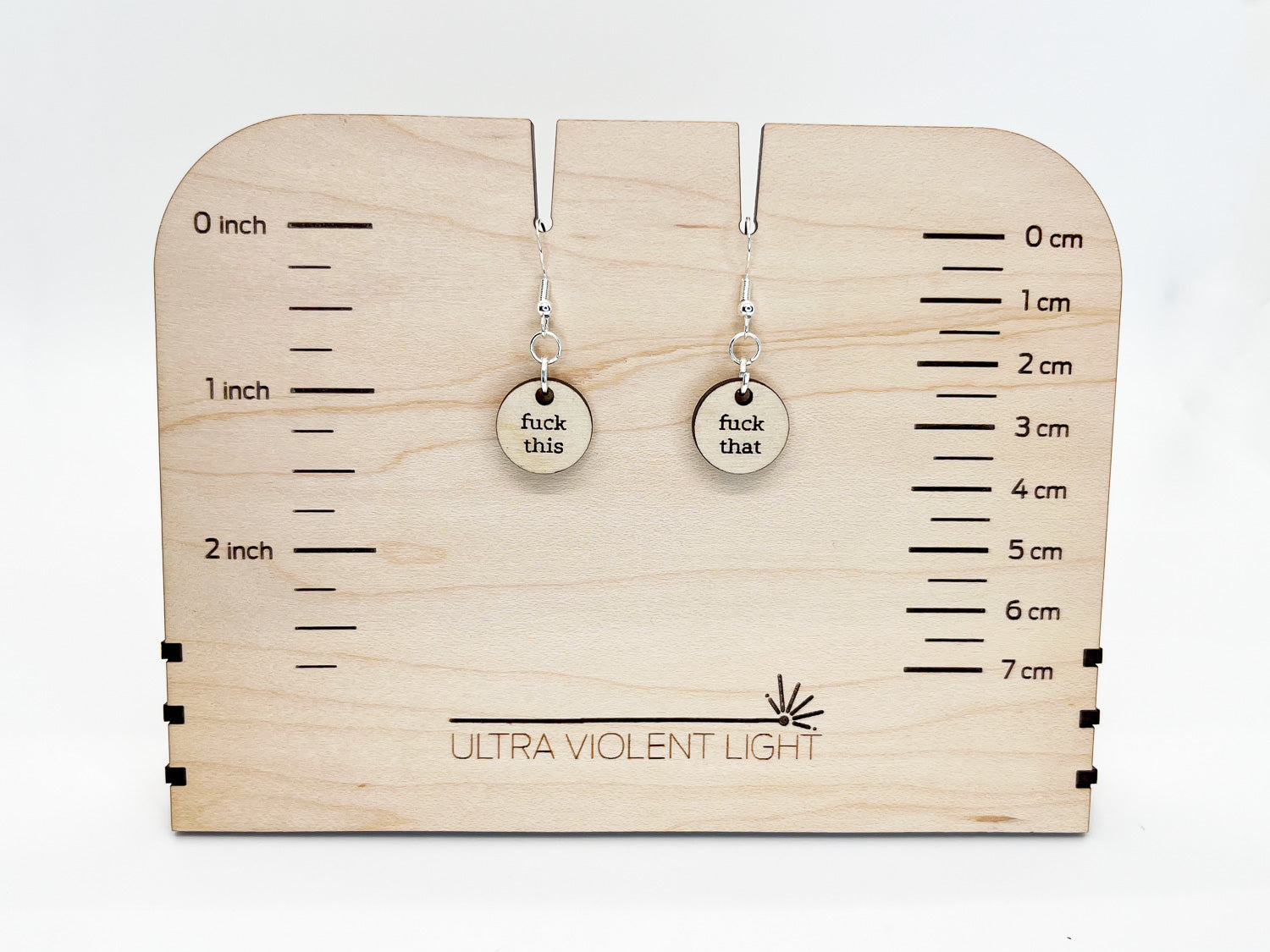 When you've got no more fucks to give, tell the world (subtly). Your chosen phrases can hang from each ear on laser-cut birchwood earrings.