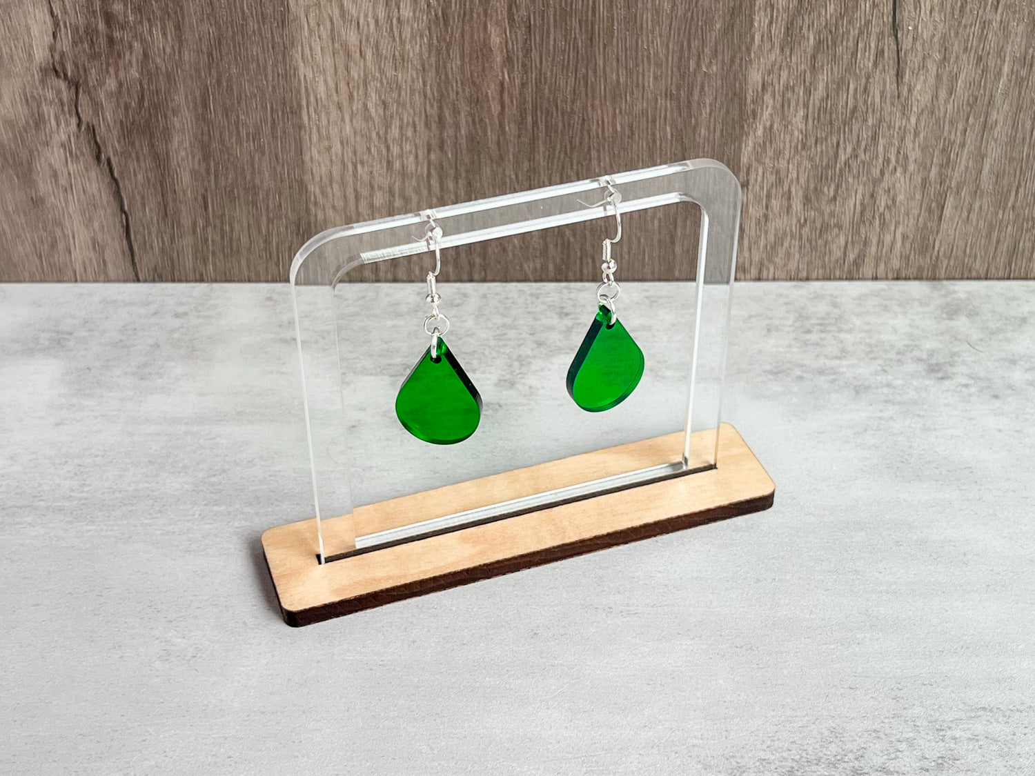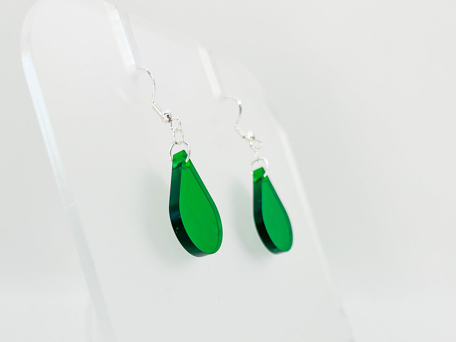 Translucent green sundrop shapes can hang from your ears! The earrings are about 1 3/4 inches long, made of acrylic. Ear hooks are silver plated, great for sensitive ears.
