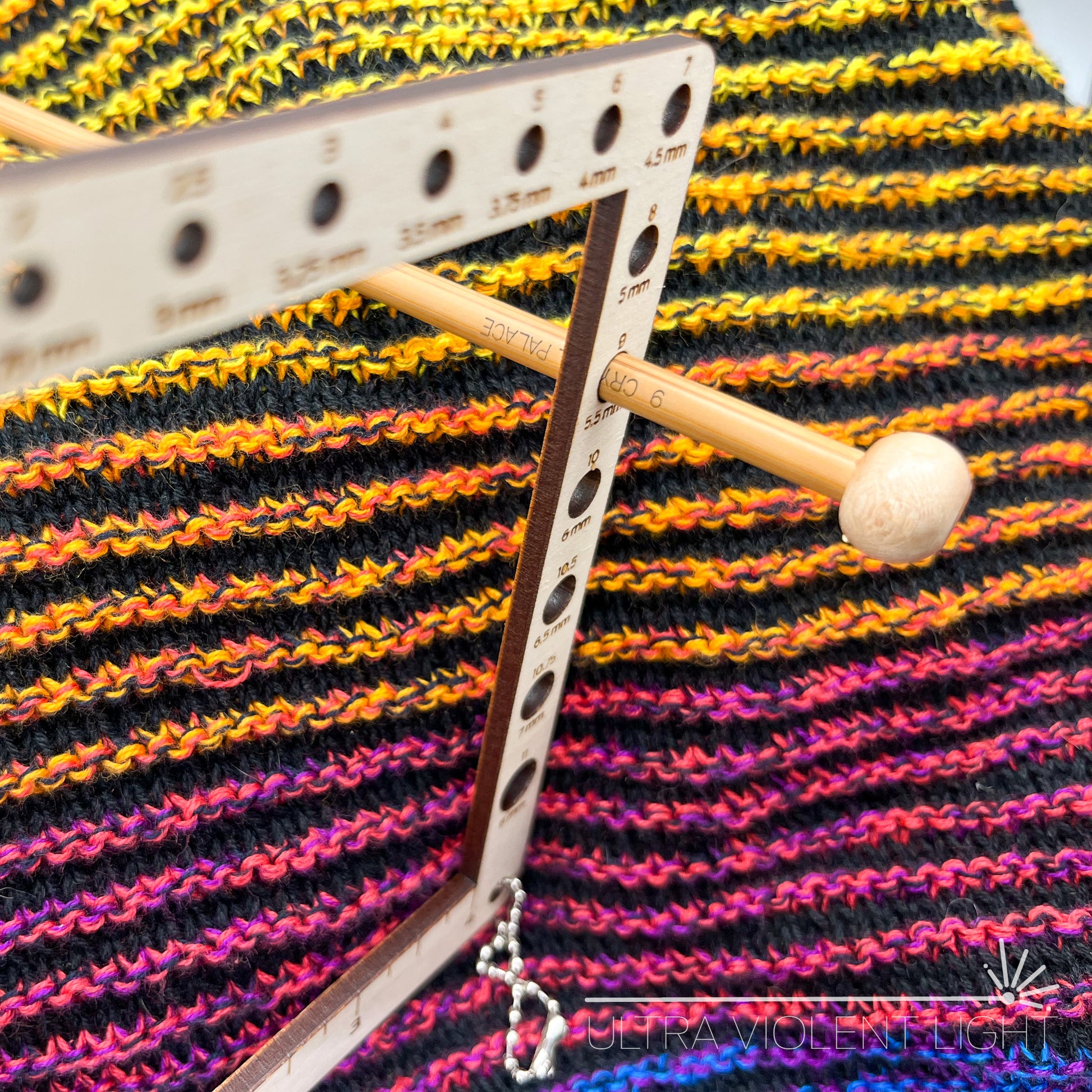 This cute sizer will measure your knitting needles from US size 0 to 17.