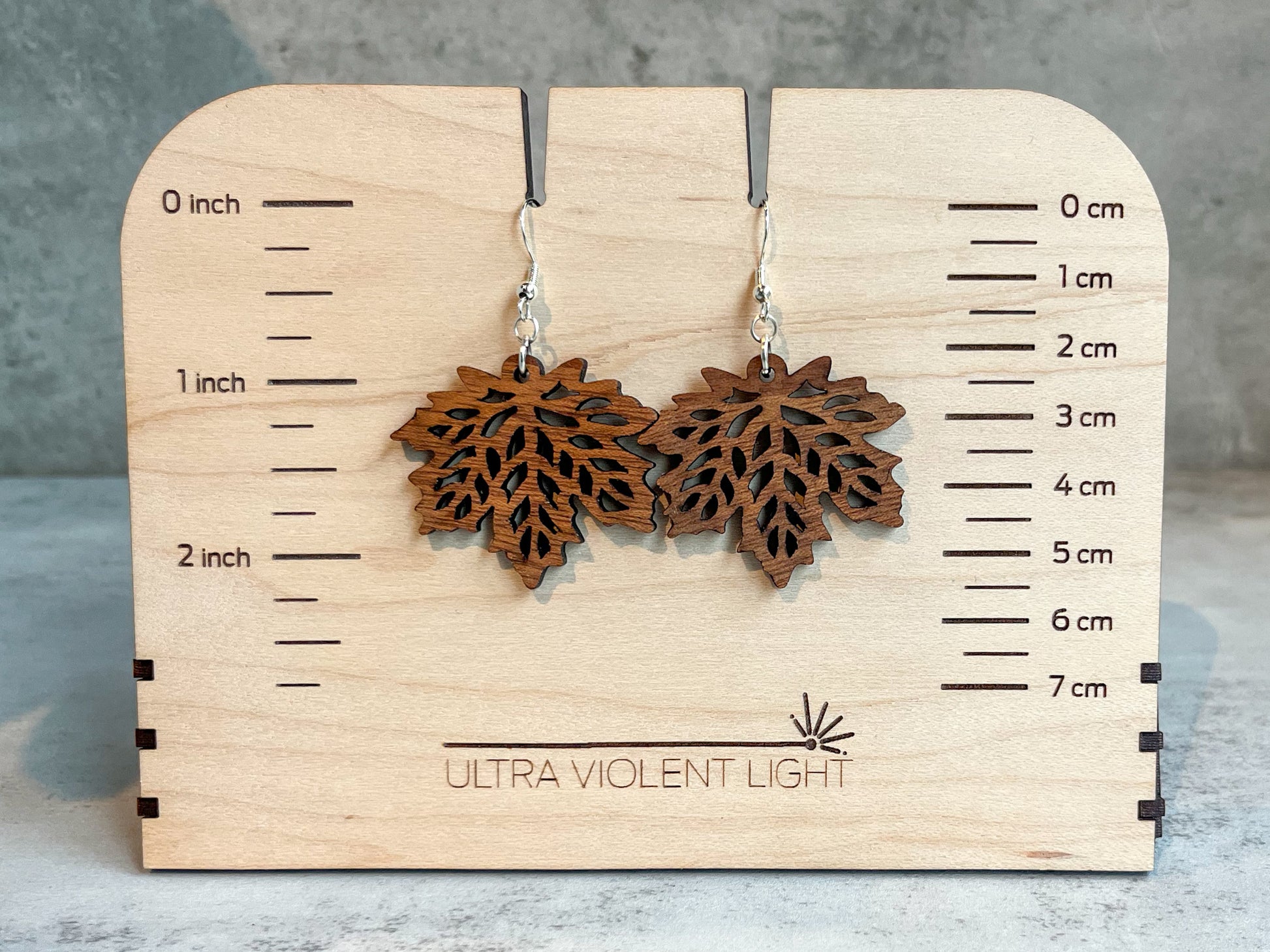 These earrings are engraved from sapele wood, and hang from sterling silver-plated hooks.