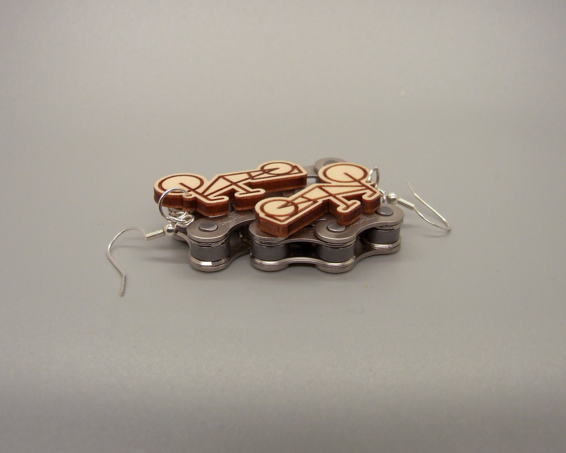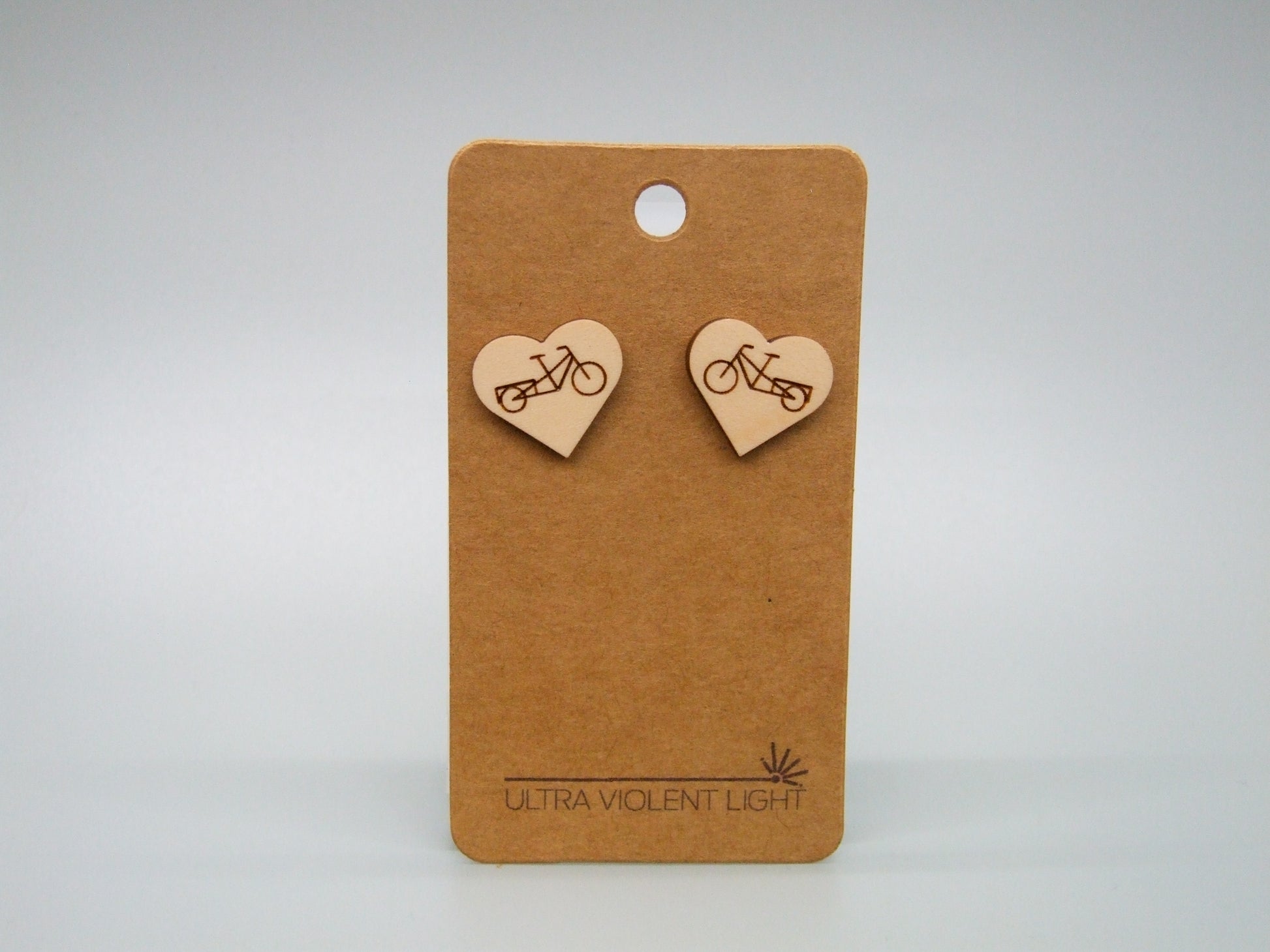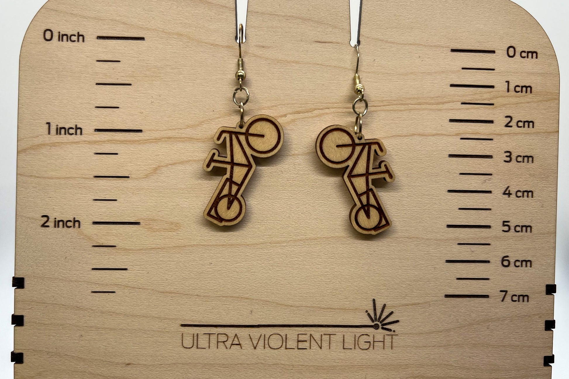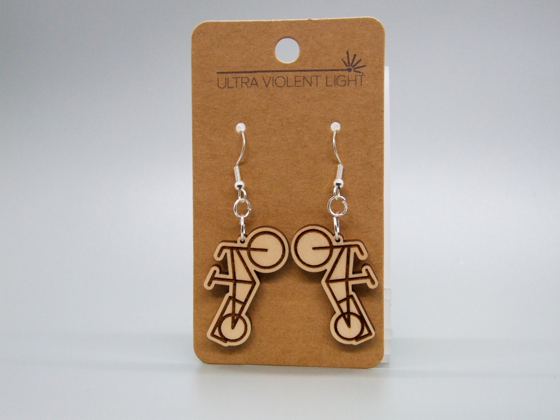 A longtail cargo bike is laser engraved on finished maple plywood. Choose from hook or post earrings.