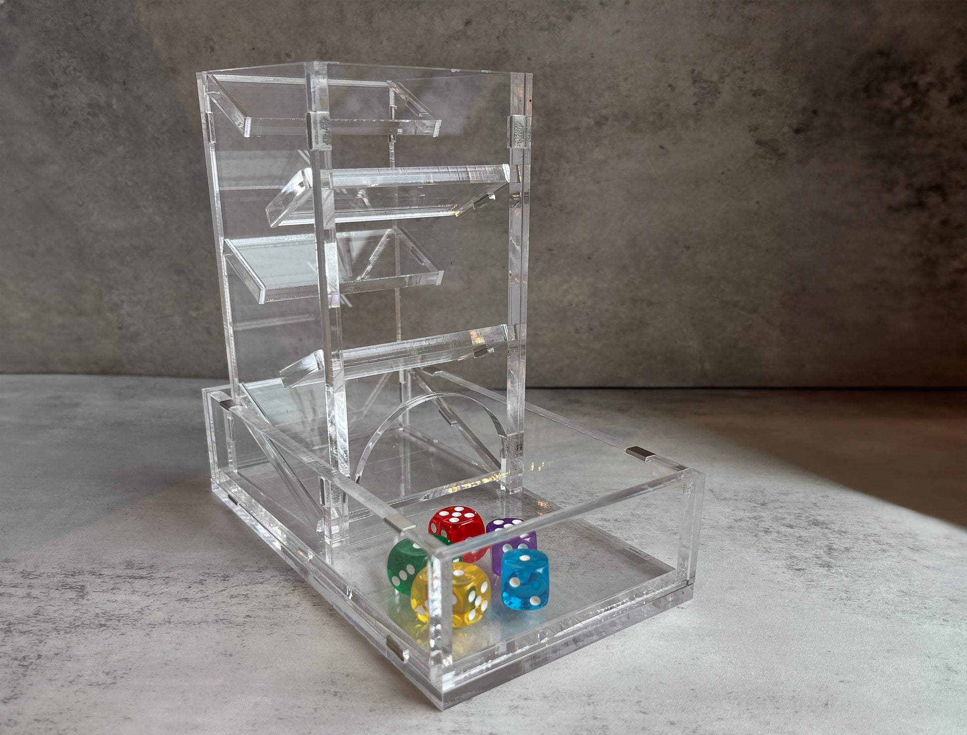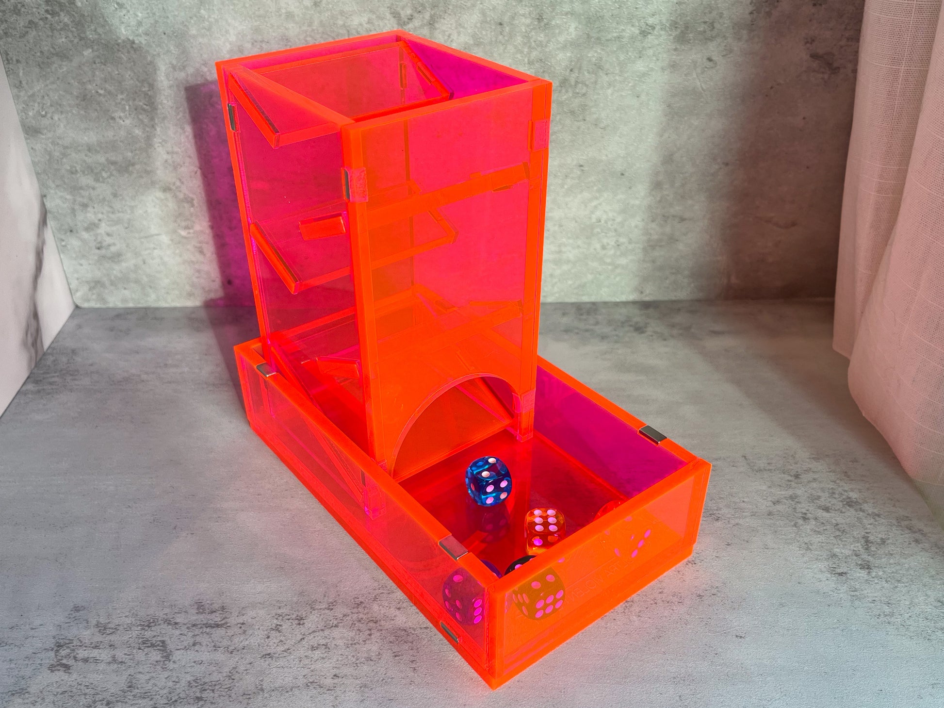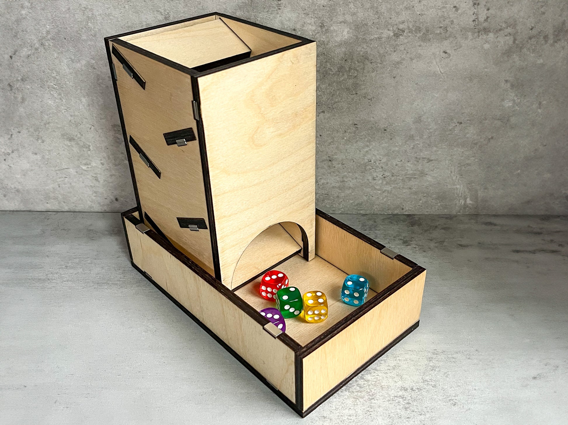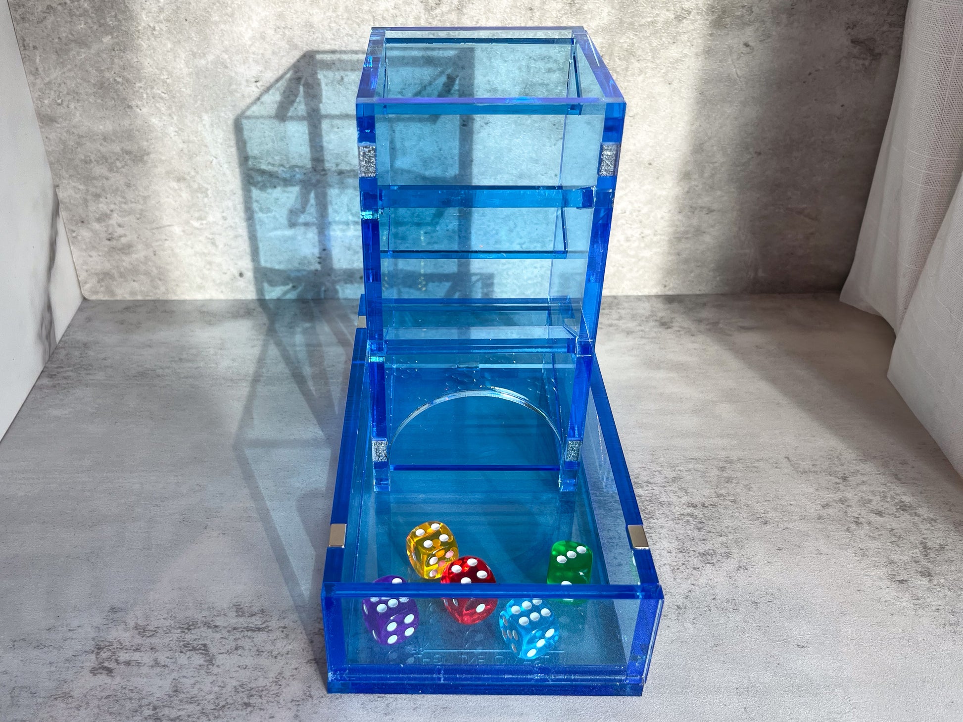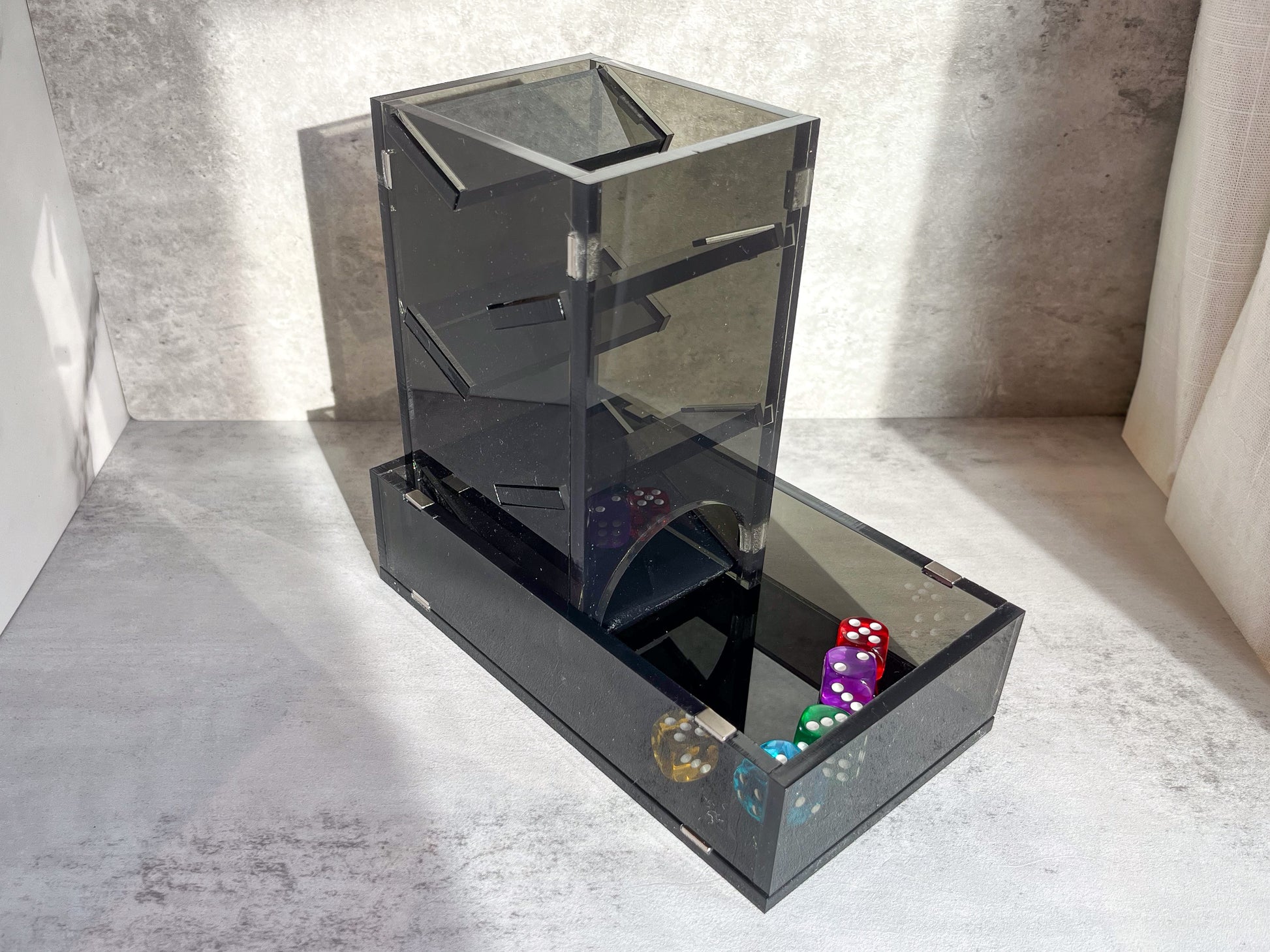 Display your dice rolls with style, then take this dice tower apart to store it like a book when you're through. Made with 25 neodymium magnets and 1/4" acrylic (except for the birchwood version), it's sturdy enough to stand up to your longest campaigns.