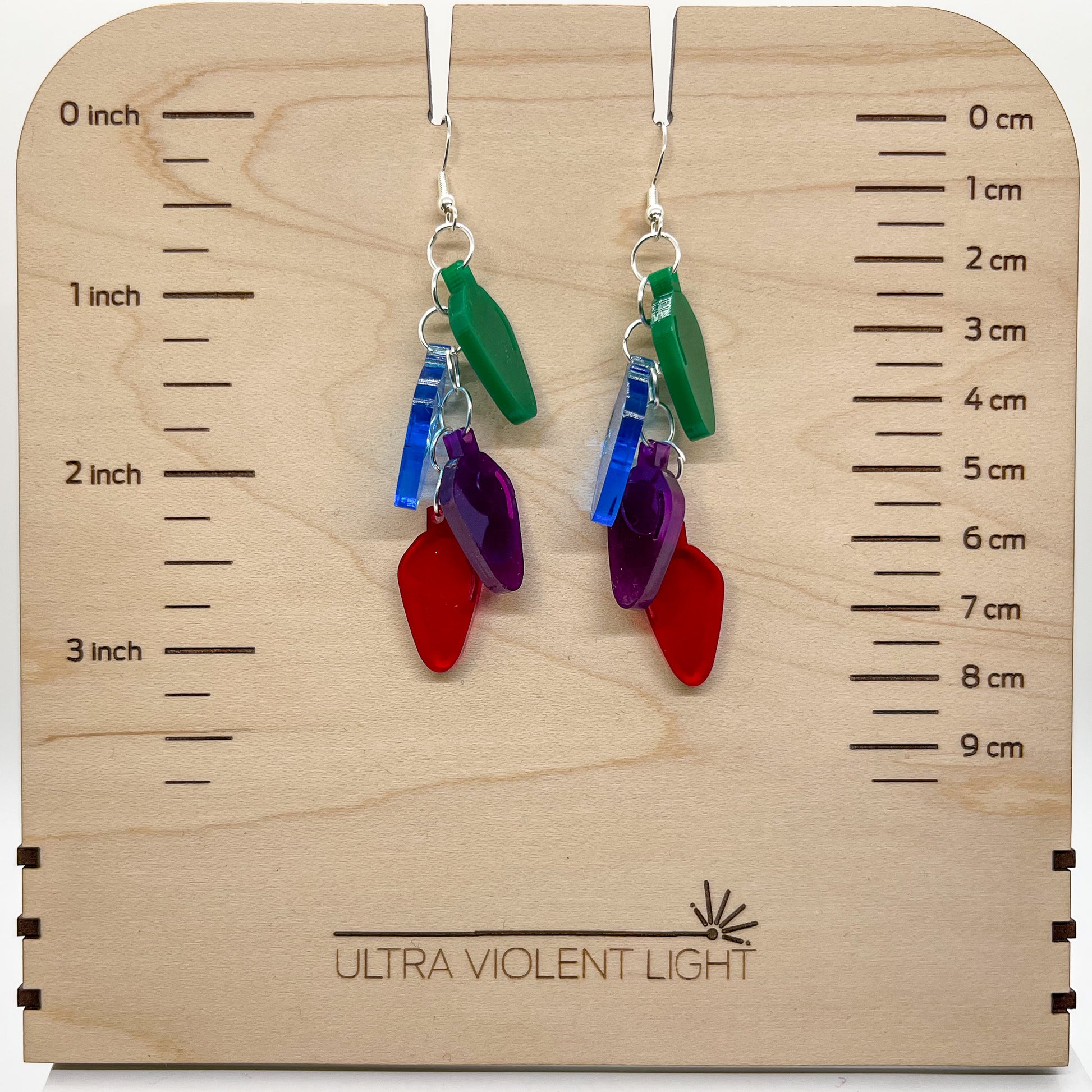The earrings are about 2 1/8 inches long. There are four charms in these extra-dangly earrings. Ear hooks are silver plated.