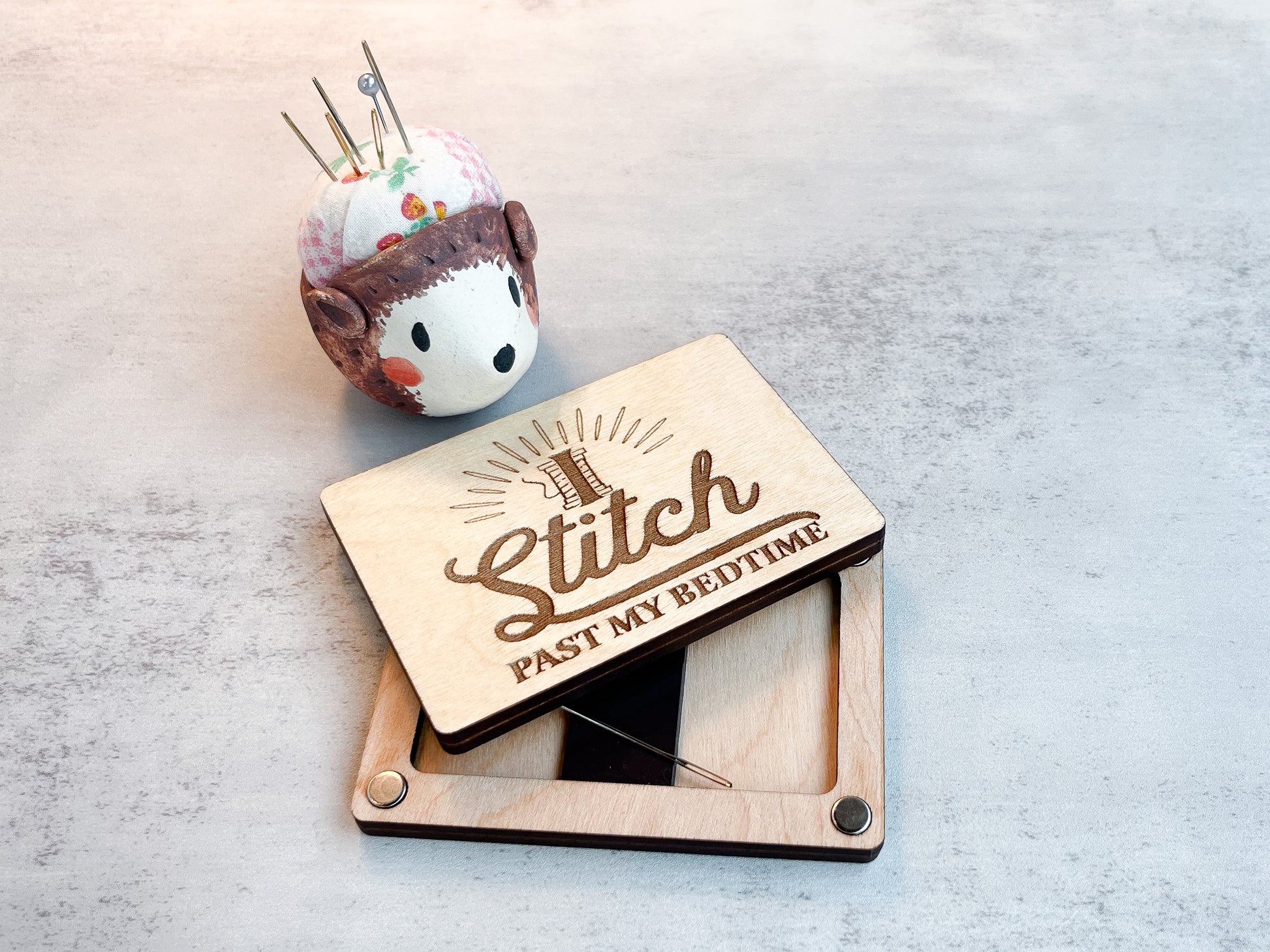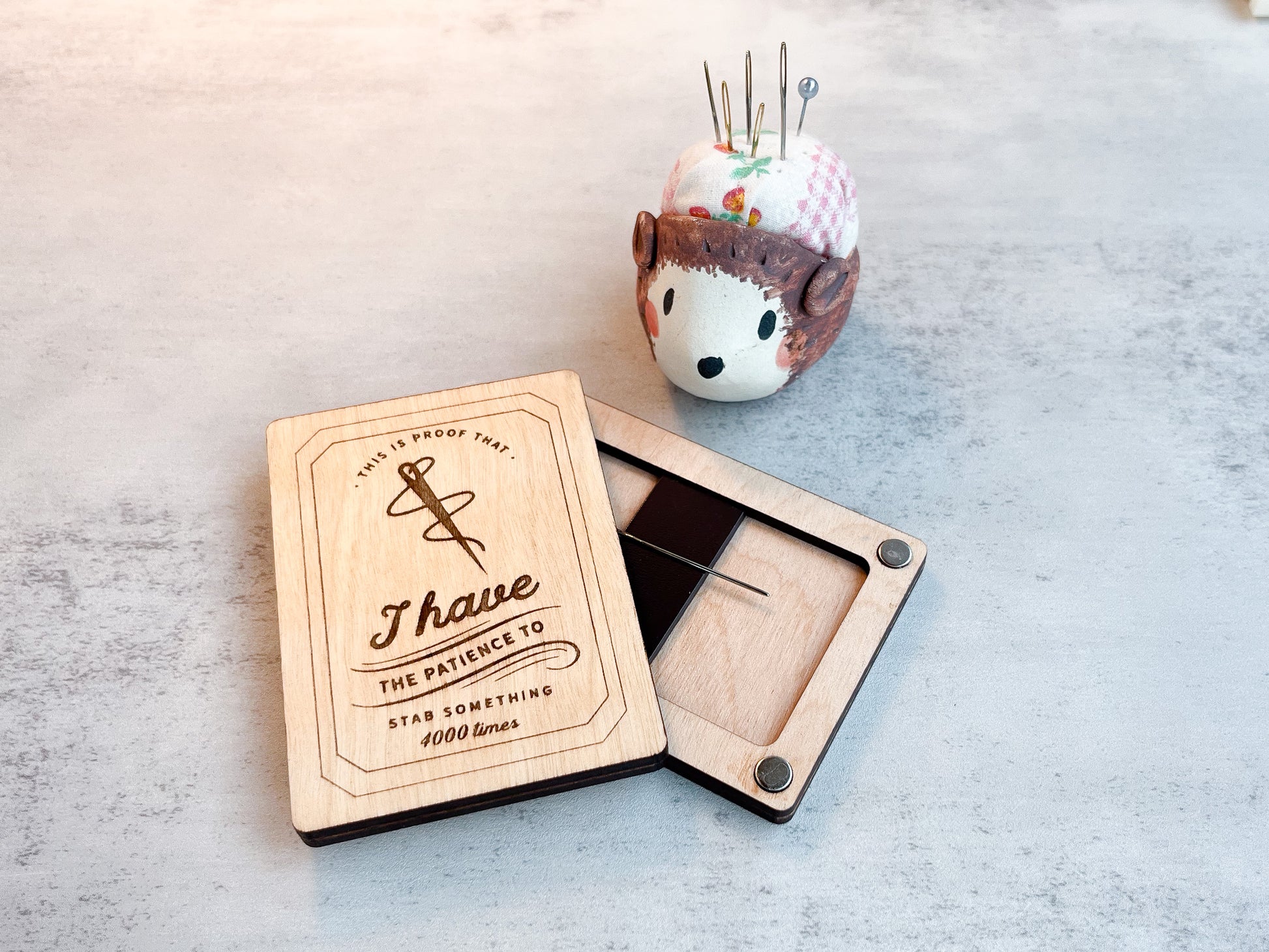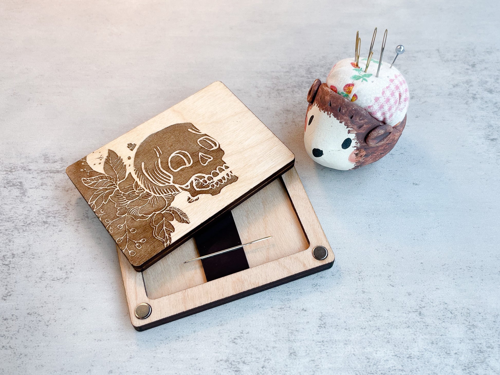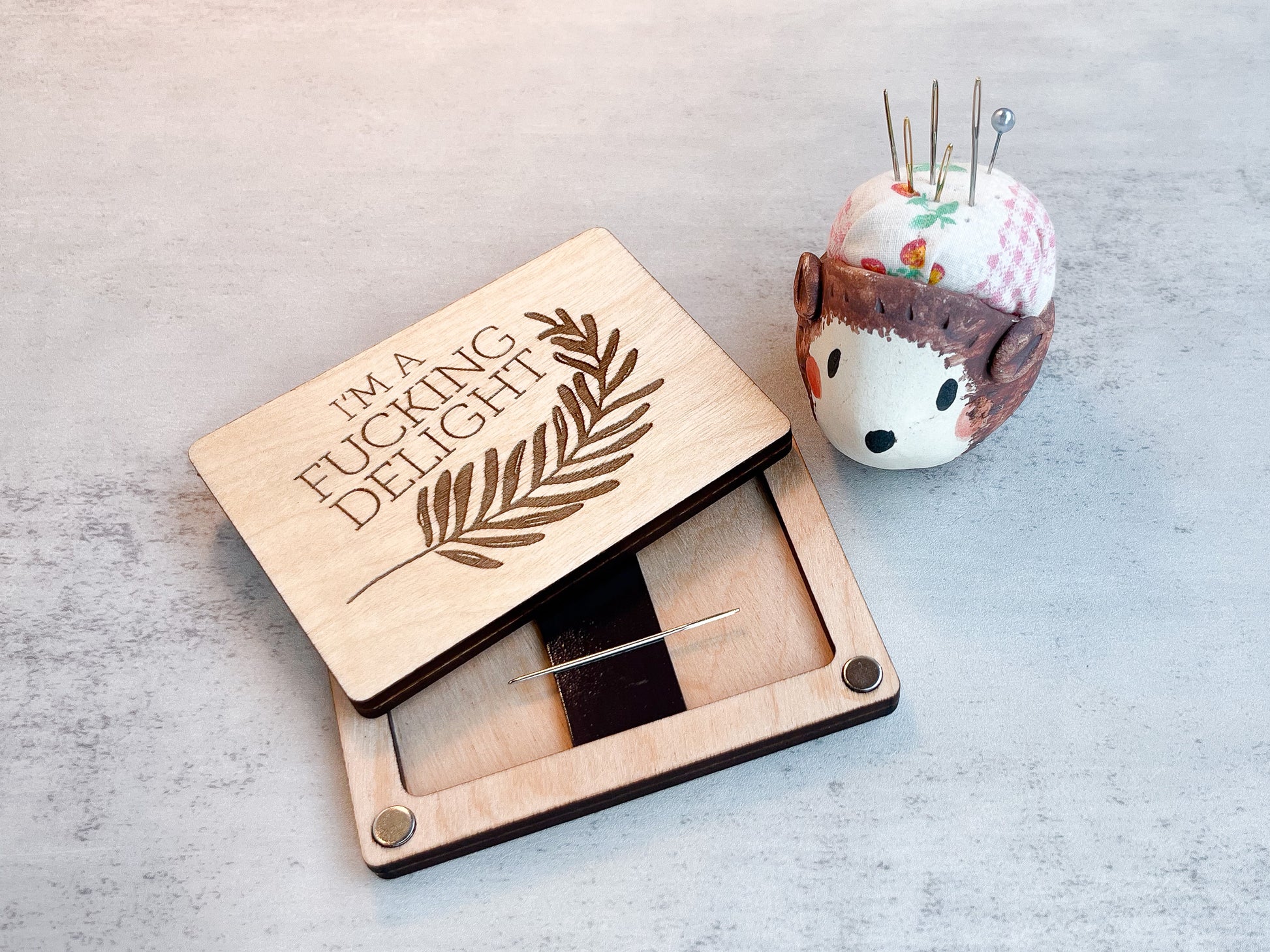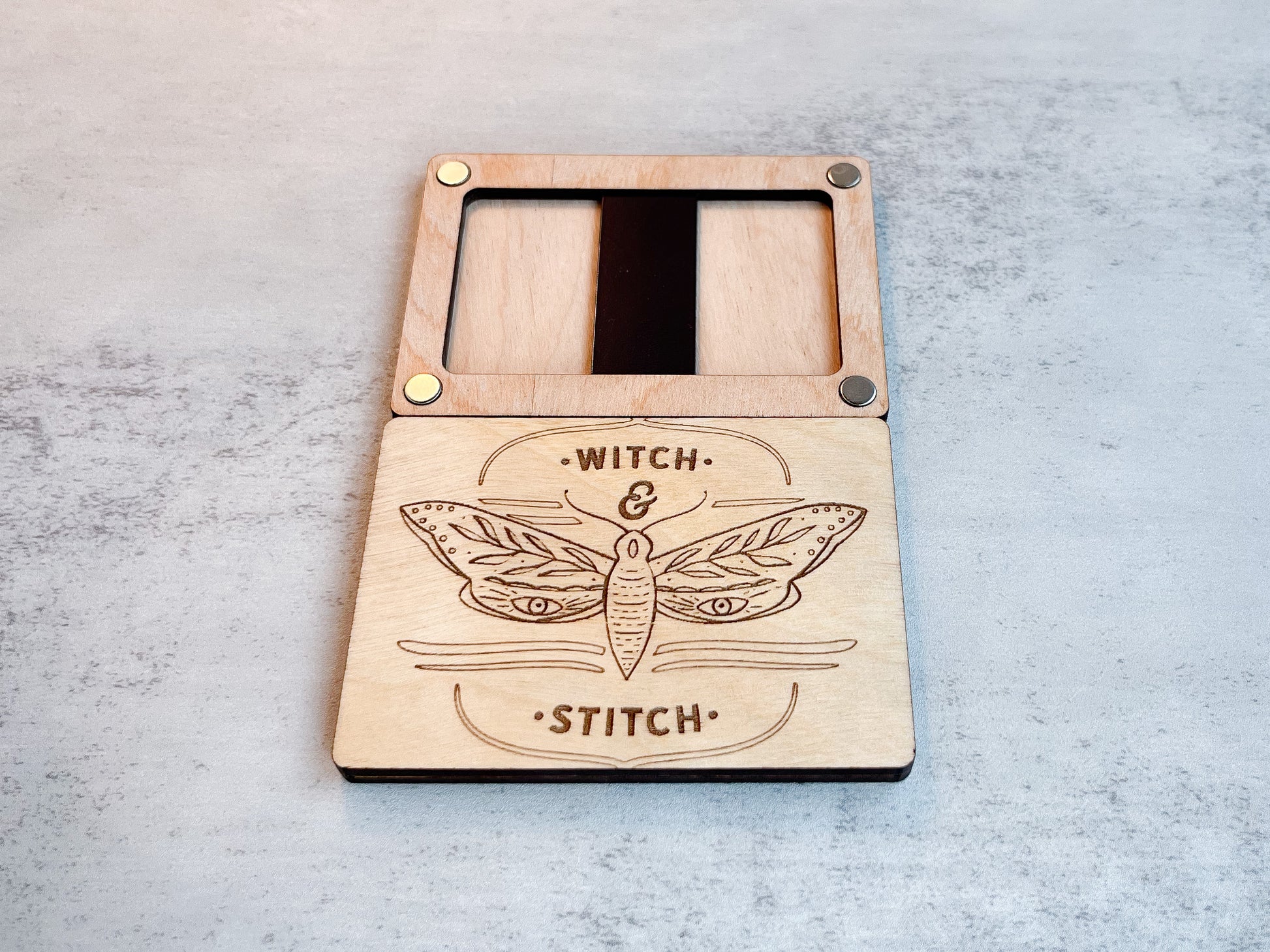 Laser engraved baltic birch is hand-sanded and finished with beeswax polish. the cases are held firmly shut with four neodymium magnets that each feature 1.5-lb pull force. Stay organized and sassy while crafting!