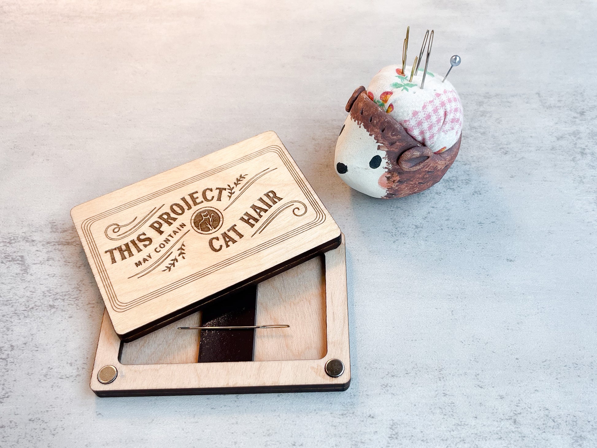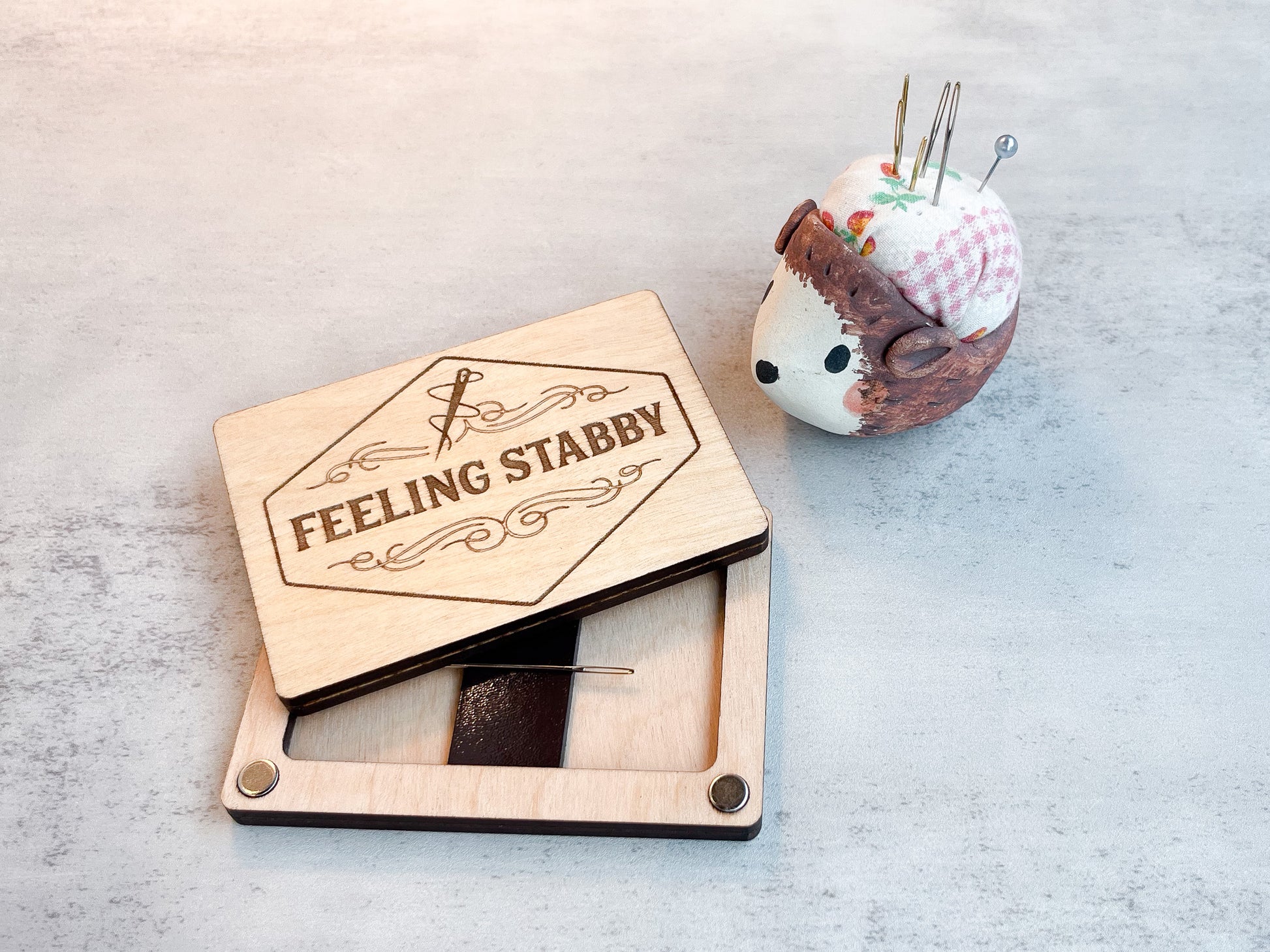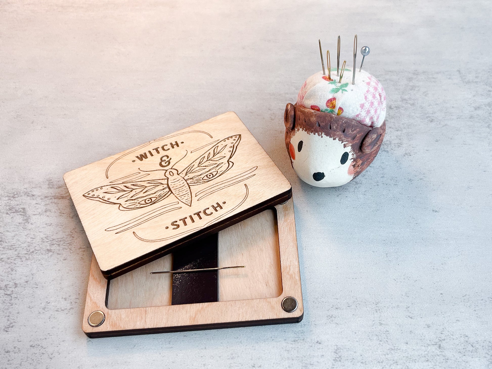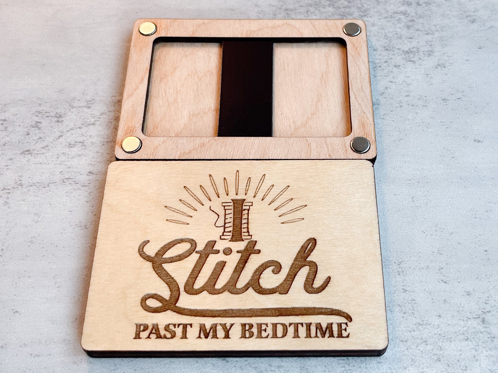 Laser engraved baltic birch is hand-sanded and finished with beeswax polish. the cases are held firmly shut with four neodymium magnets that each feature 1.5-lb pull force. Stay organized and sassy while crafting!