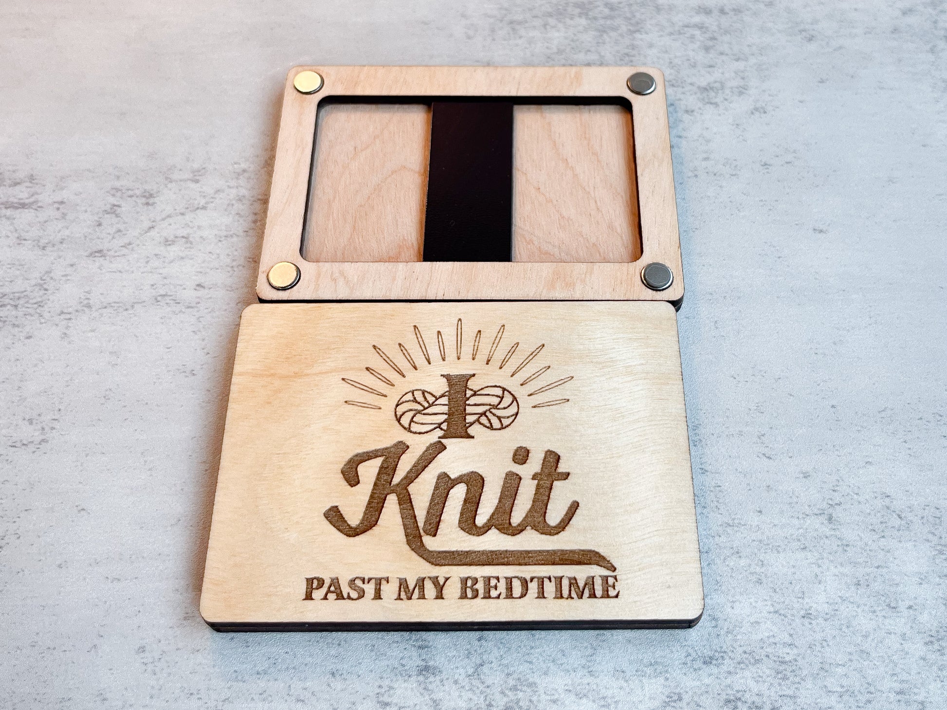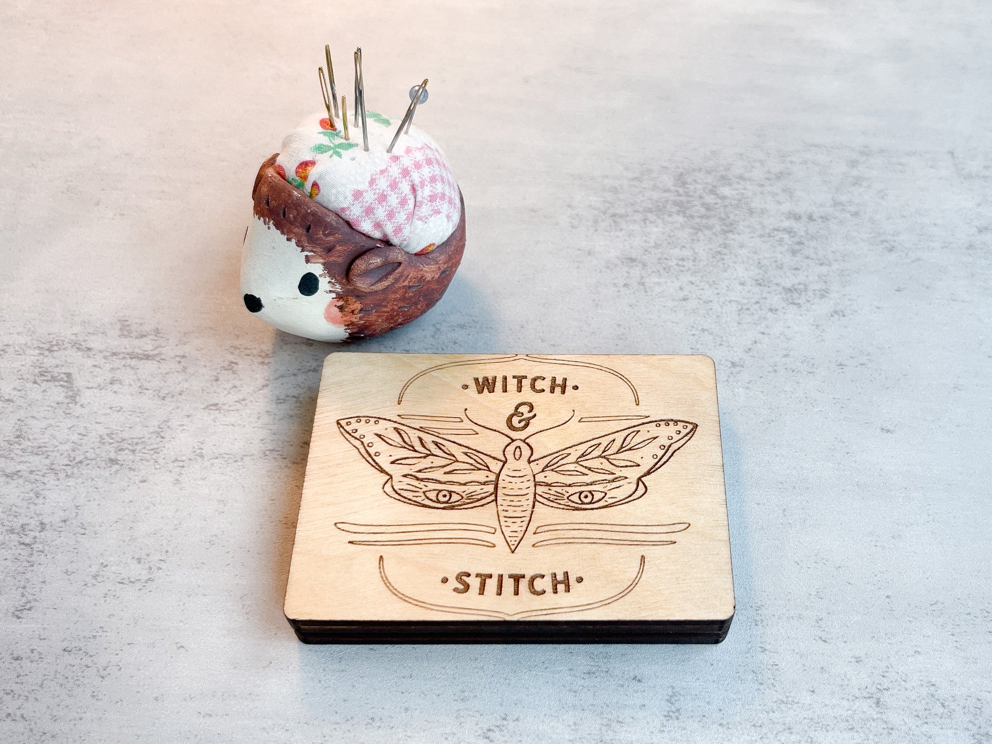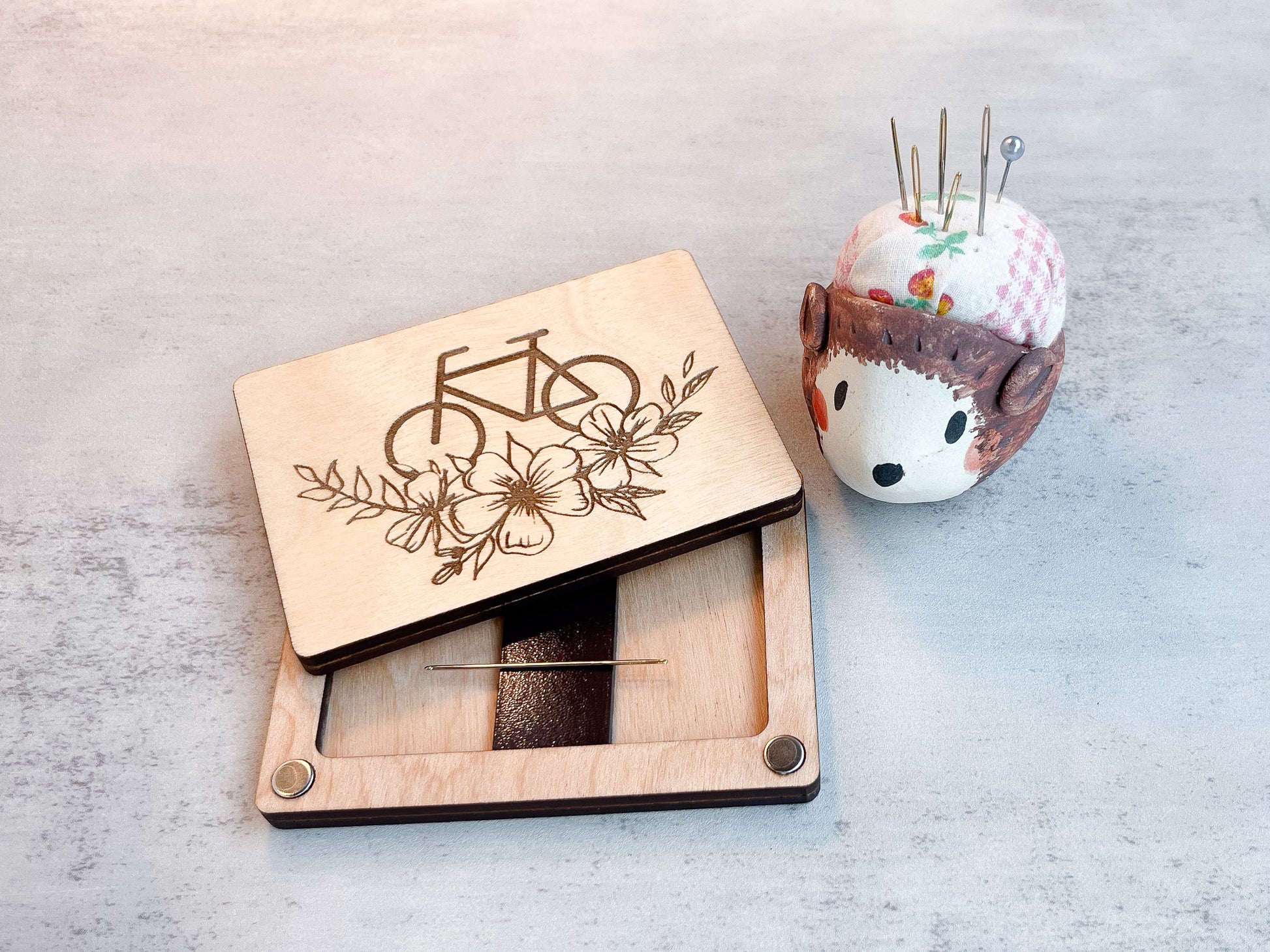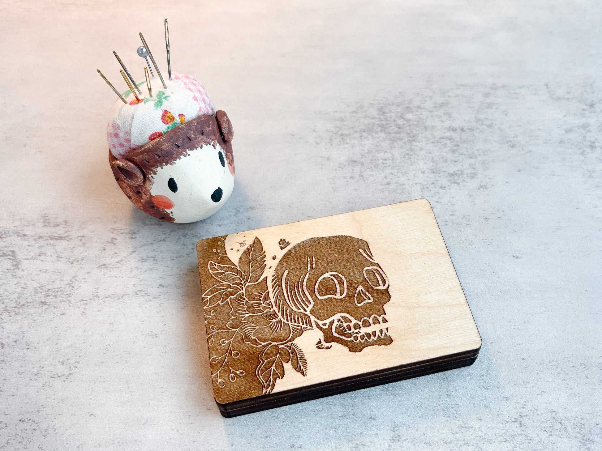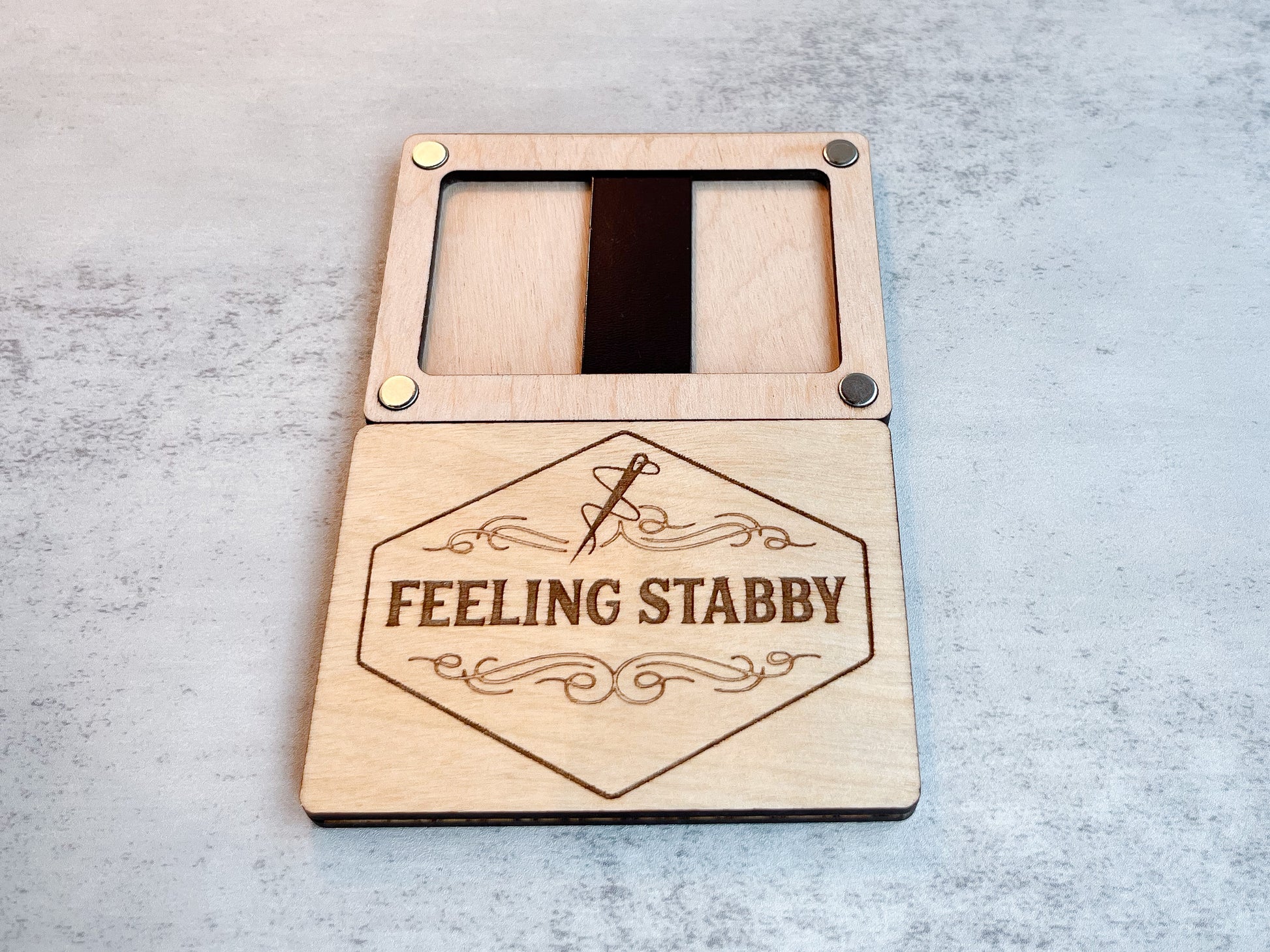 Laser engraved baltic birch is hand-sanded and finished with beeswax polish. the cases are held firmly shut with four neodymium magnets that each feature 1.5-lb pull force. Stay organized and sassy while crafting!
