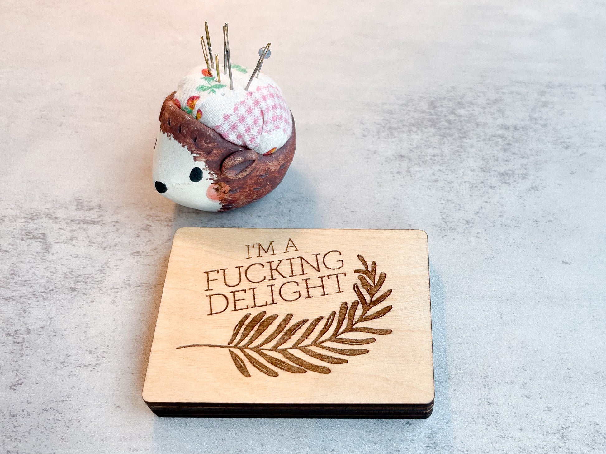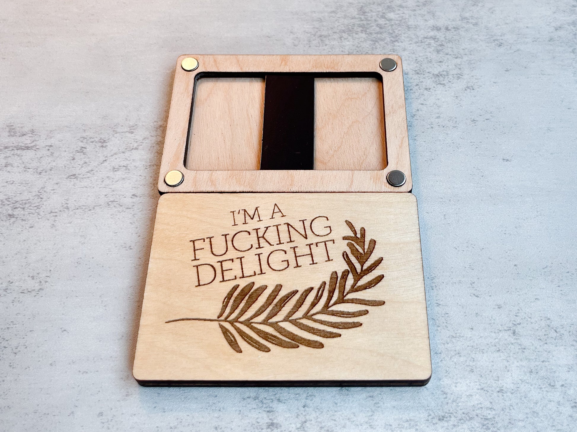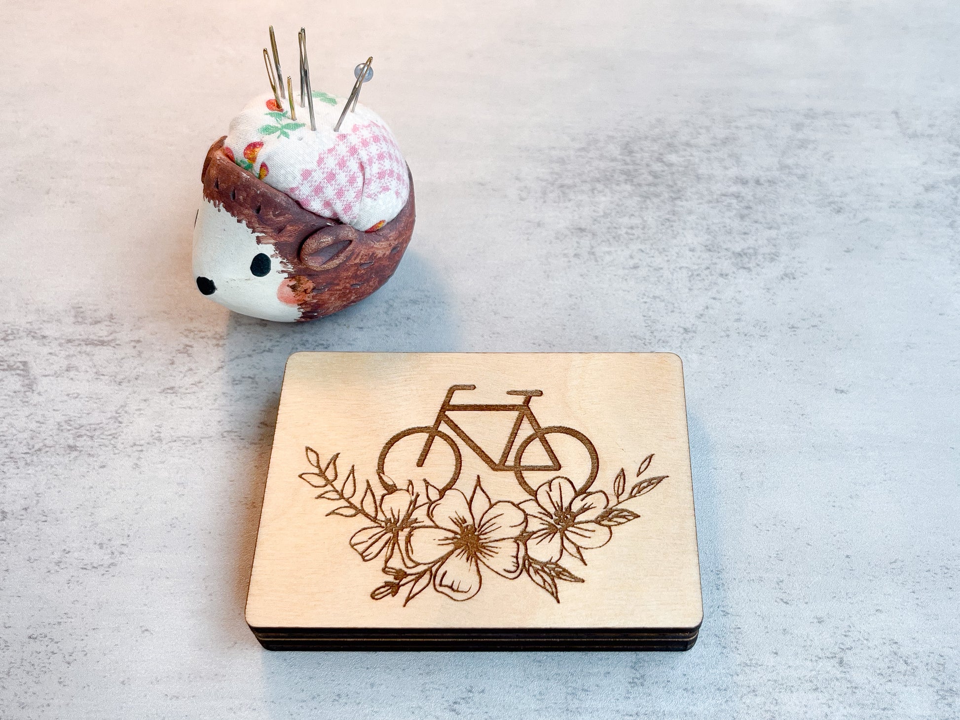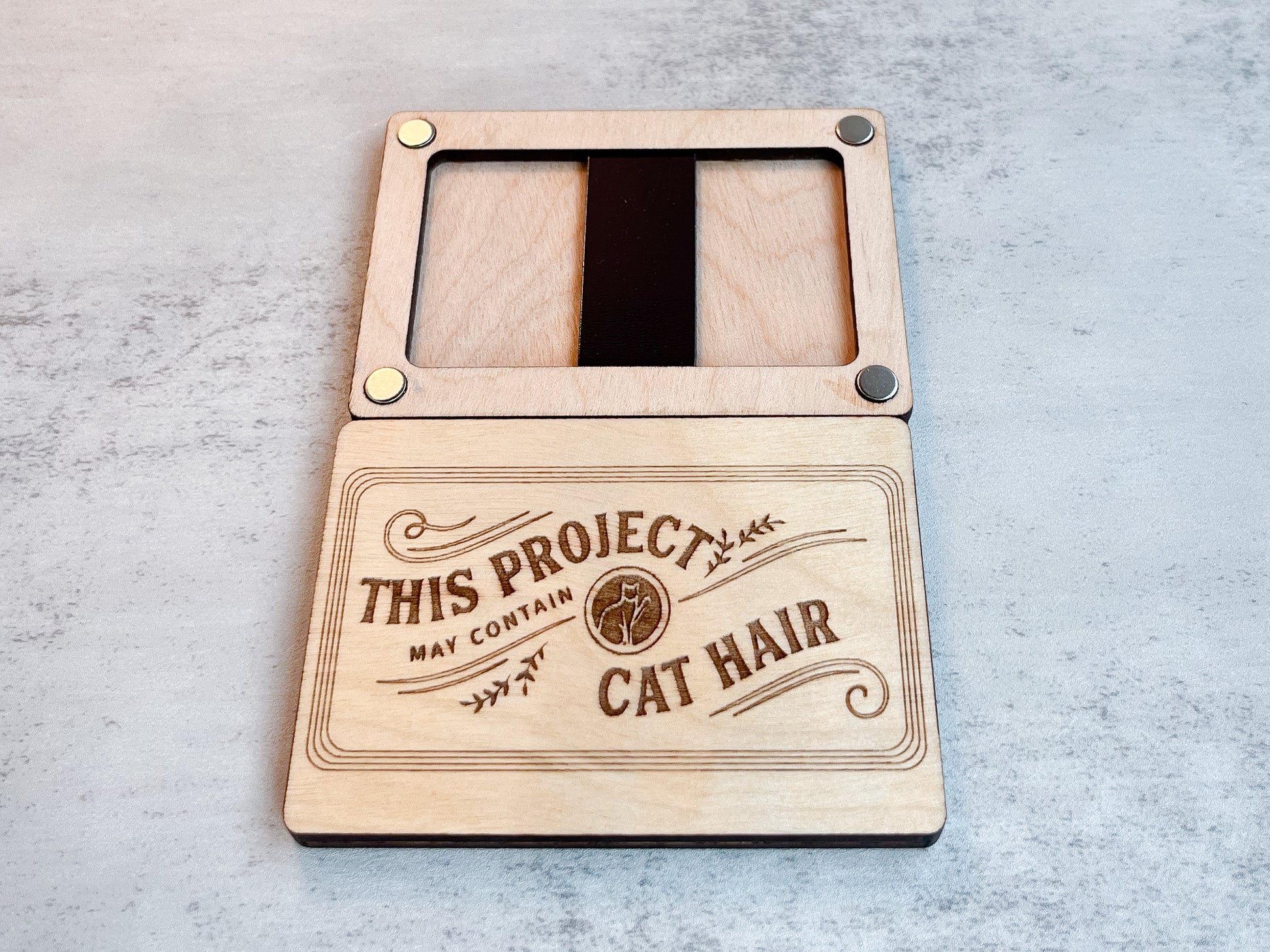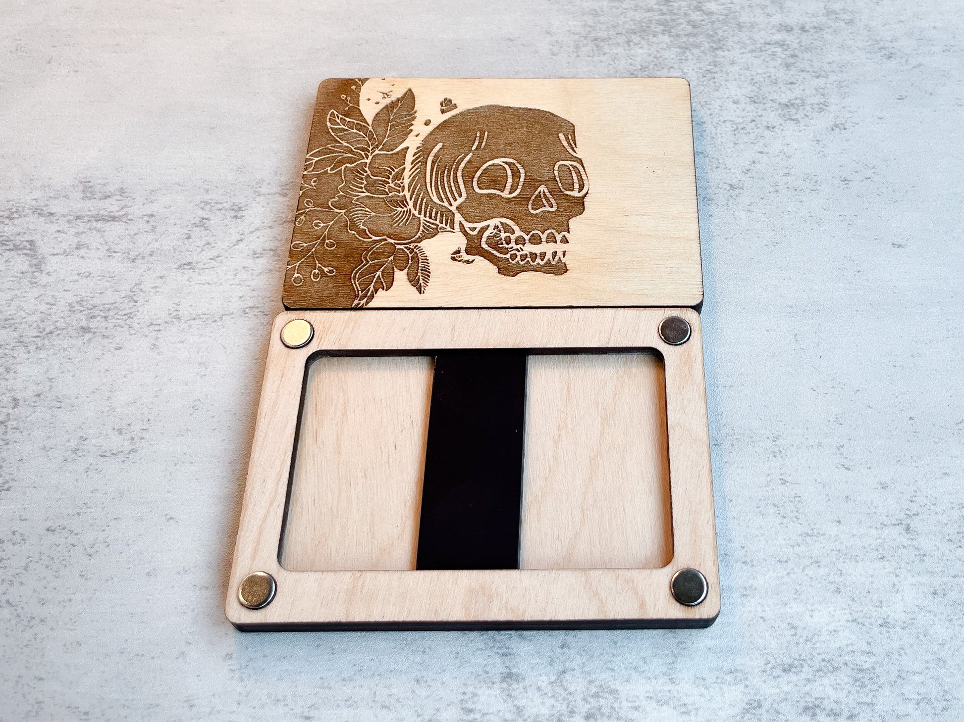 Laser engraved baltic birch is hand-sanded and finished with beeswax polish. the cases are held firmly shut with four neodymium magnets that each feature 1.5-lb pull force. Stay organized and sassy while crafting!