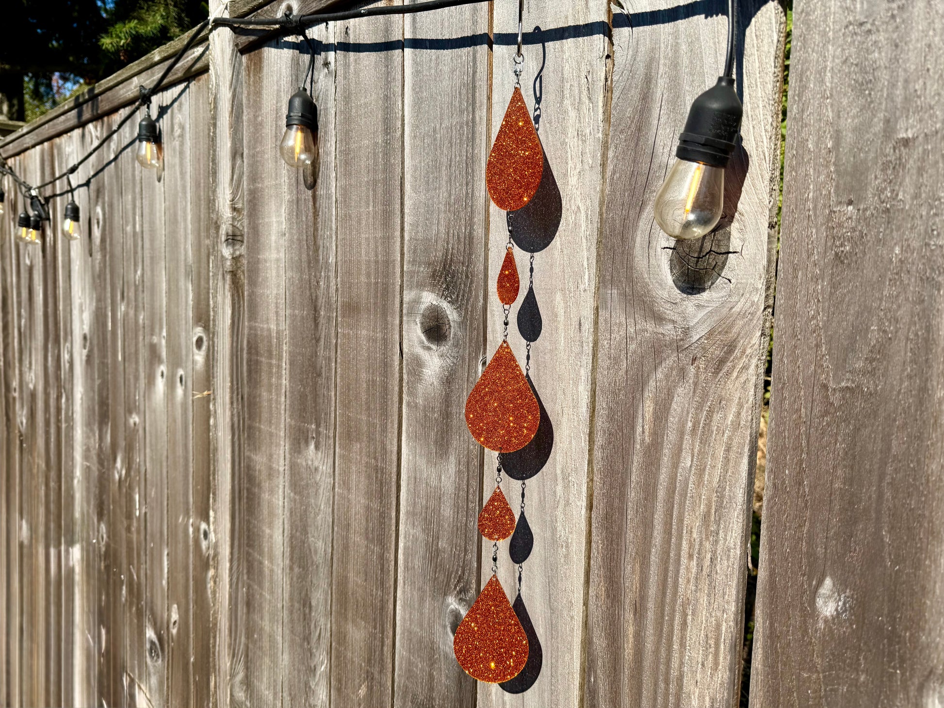The drops are made of acrylic and the fasteners are made of metal jump rings and weather-resistant fishing barrels so the sundrops rotate freely.