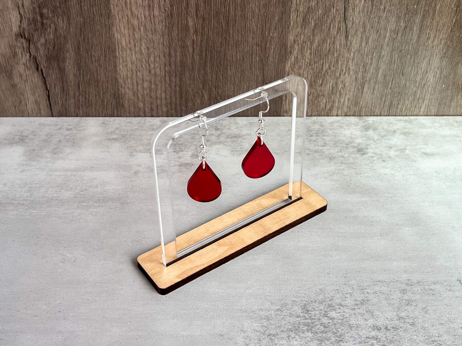 Translucent red sundrop shapes can hang from your ears! The earrings are about 1 3/4 inches long, made of acrylic. Ear hooks are silver plated, great for sensitive ears.