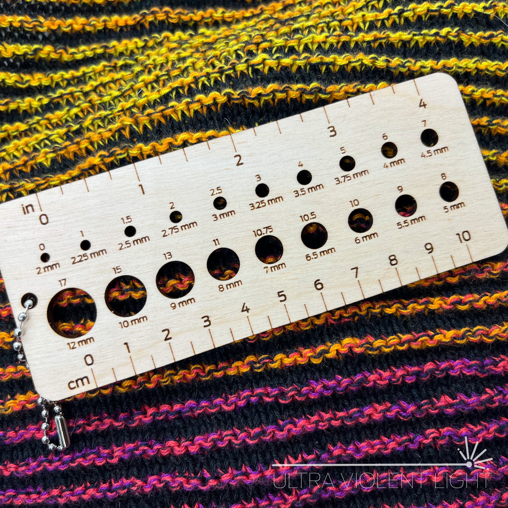 This sizer will measure your knitting needles from US size 0 to 17 (metric sizes 2-12mm) and has 4-inch and 10-cm rulers as well.