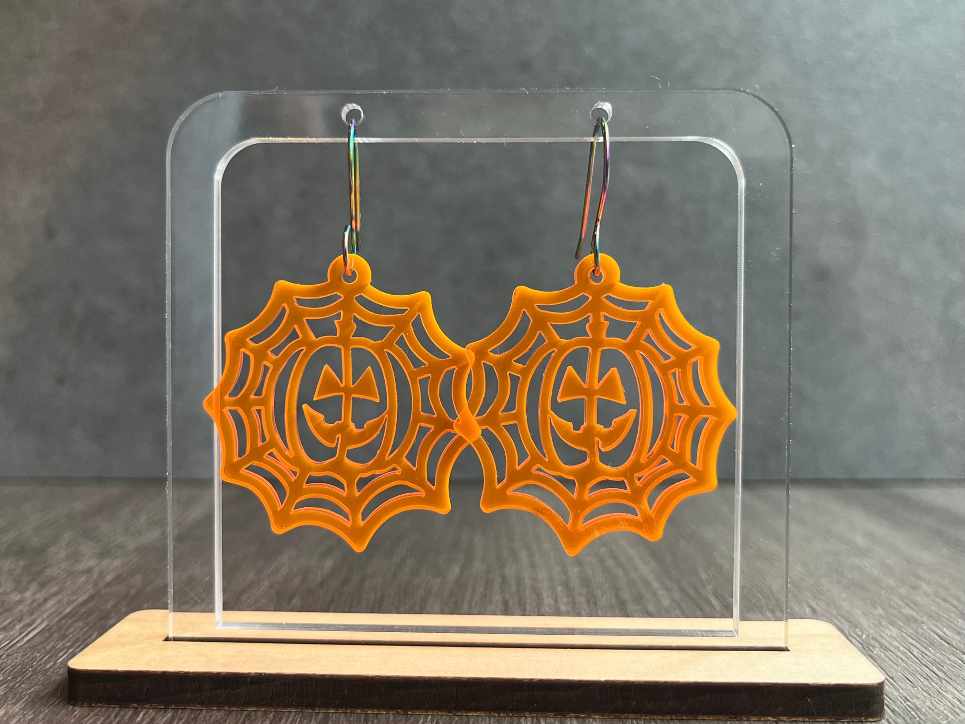 These spooky spiderwebby jack-o'-lanterns welcome in the spooky season. These are made of blacklight-reactive flourescent orange acrylic. They are finished with rainbow-colored surgical steel earring hooks, great for sensitive ears, and won't tarnish.