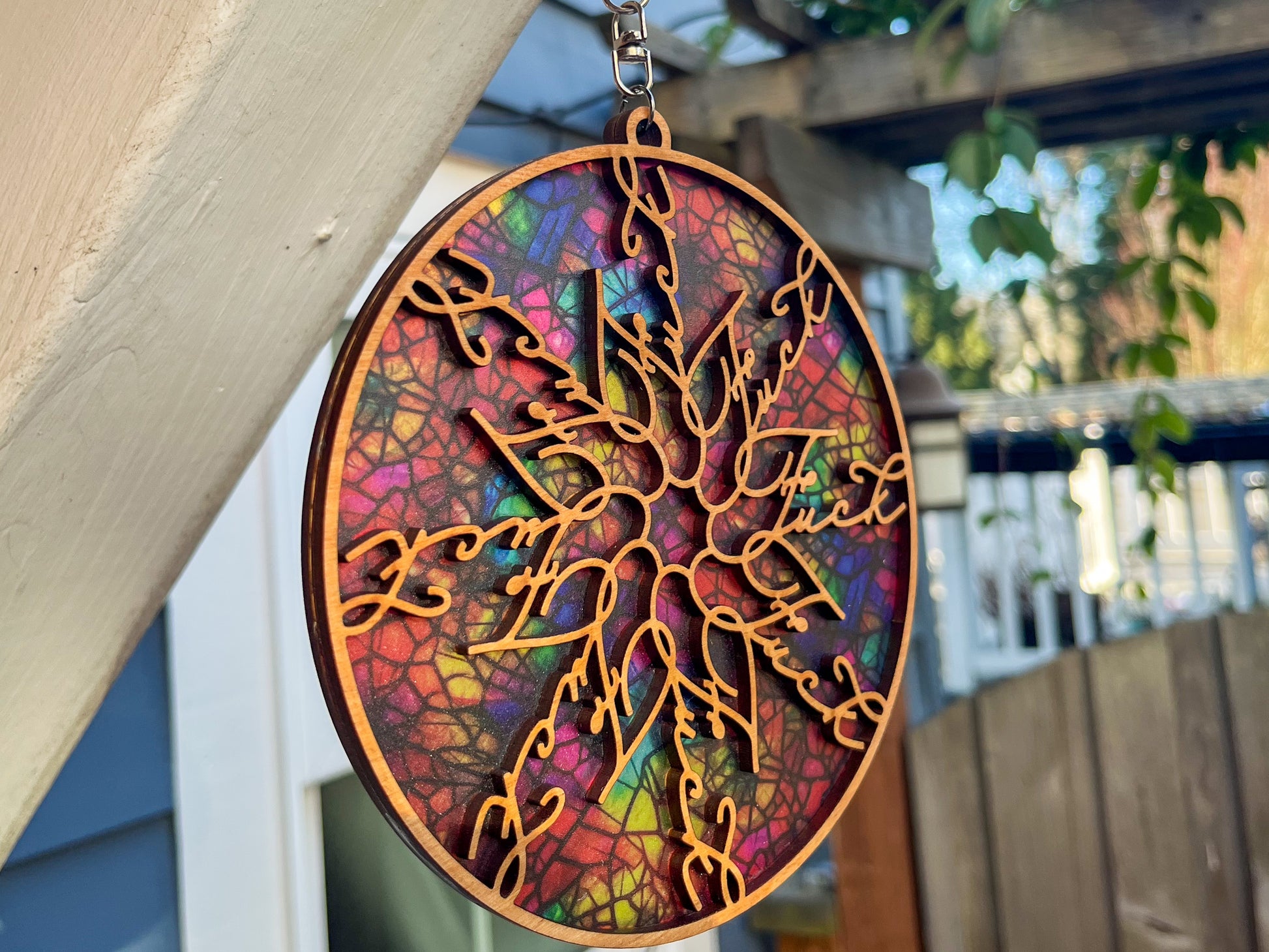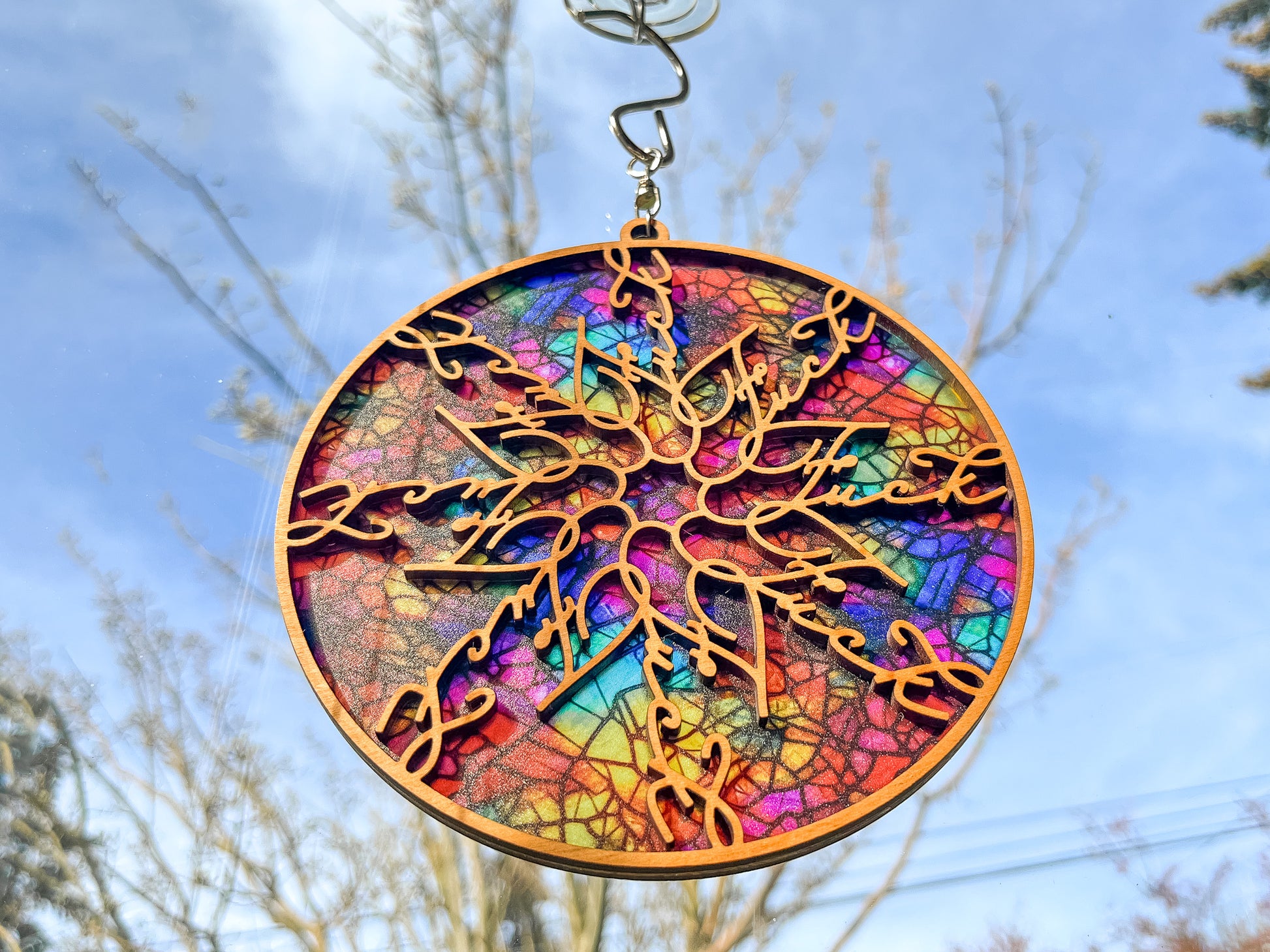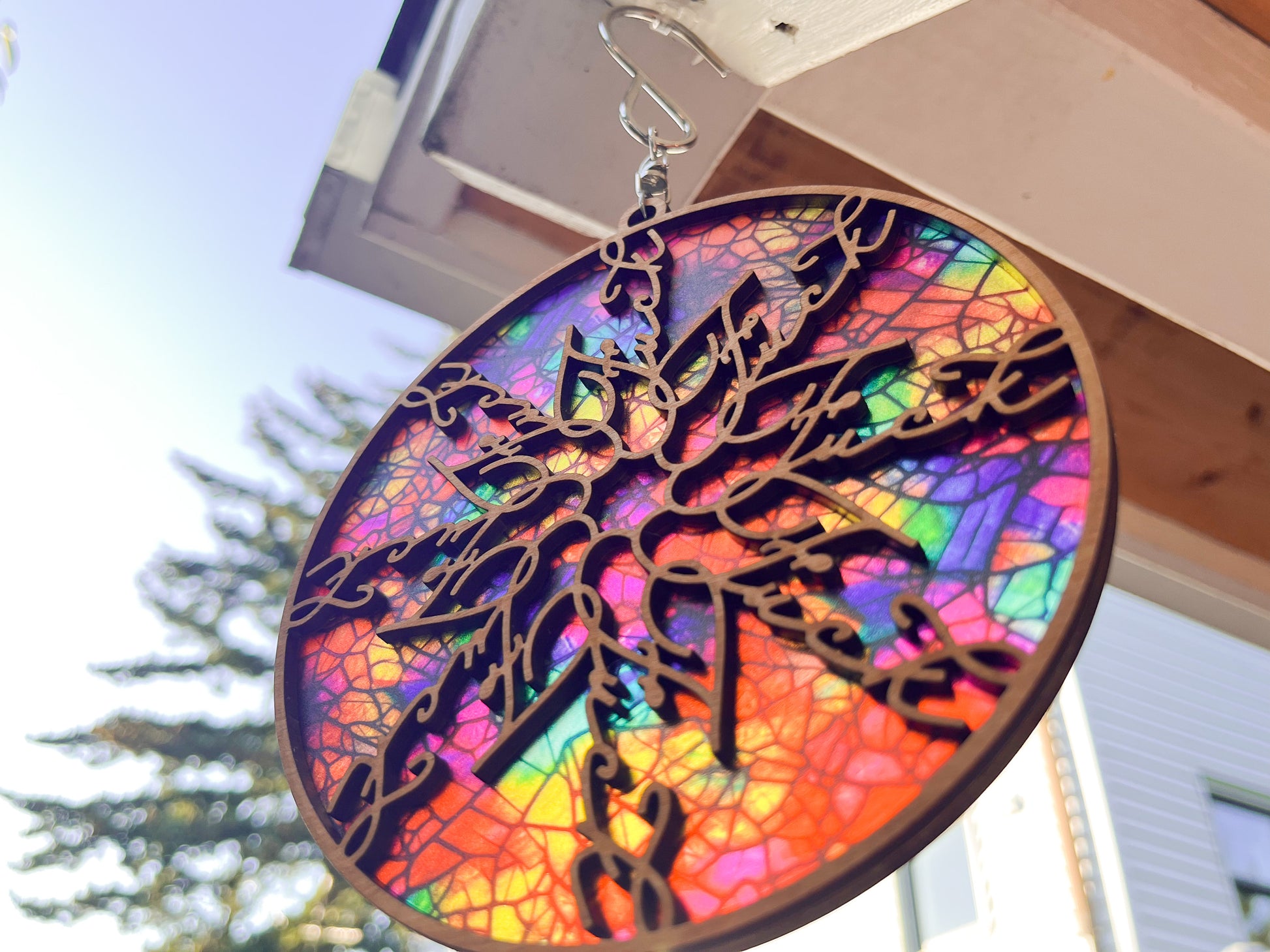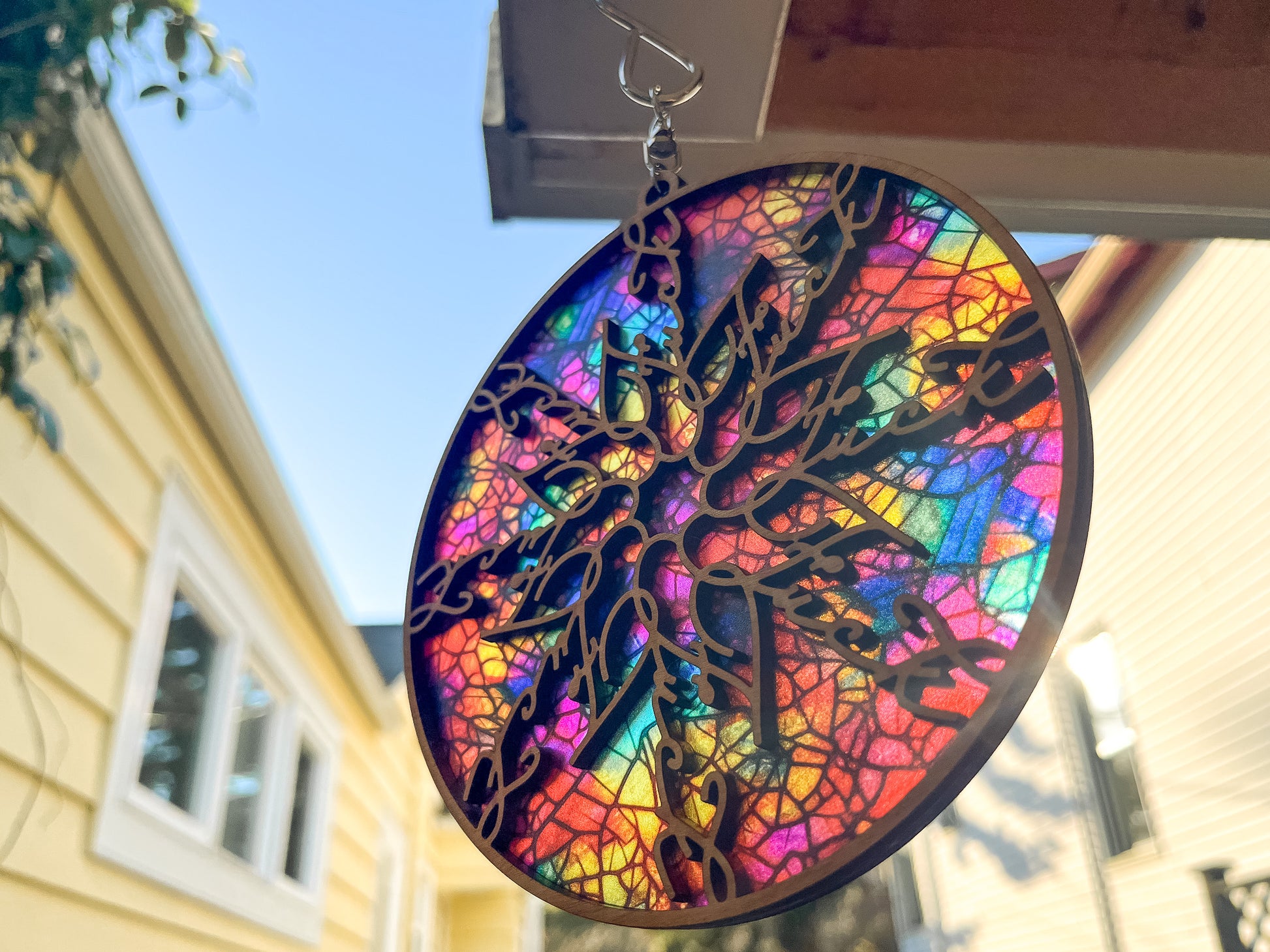 The suncatcher is attached to a swiveling hook, so it will spin easily in a light breeze. The background is made of a very thin acrylic, while the border and inset design is cut out of birch or maple plywood.
