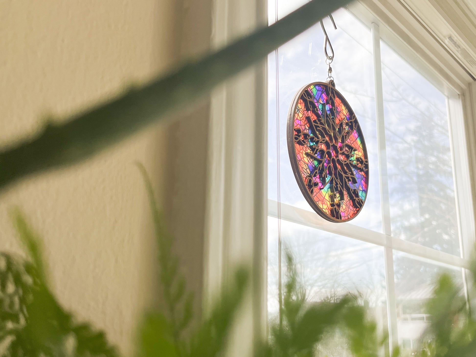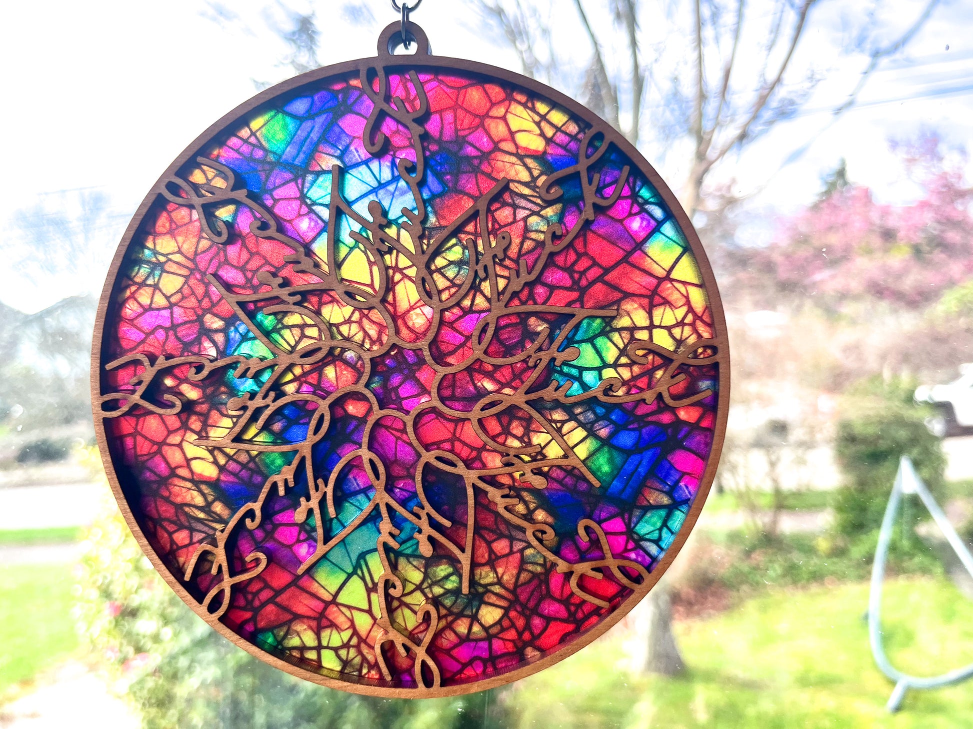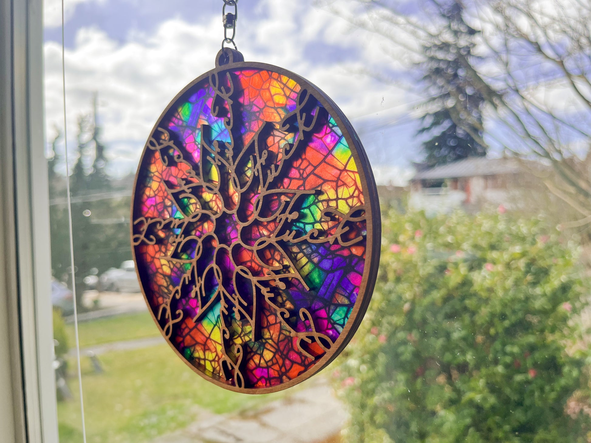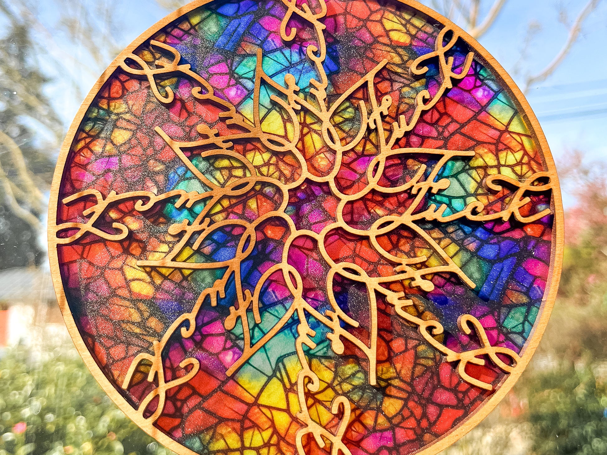 Each suncatcher's pattern will be a little bit different due to the variations in the material. This suncatcher is made of plywood and shouldn't spend extended time outside, to preserve its quality.