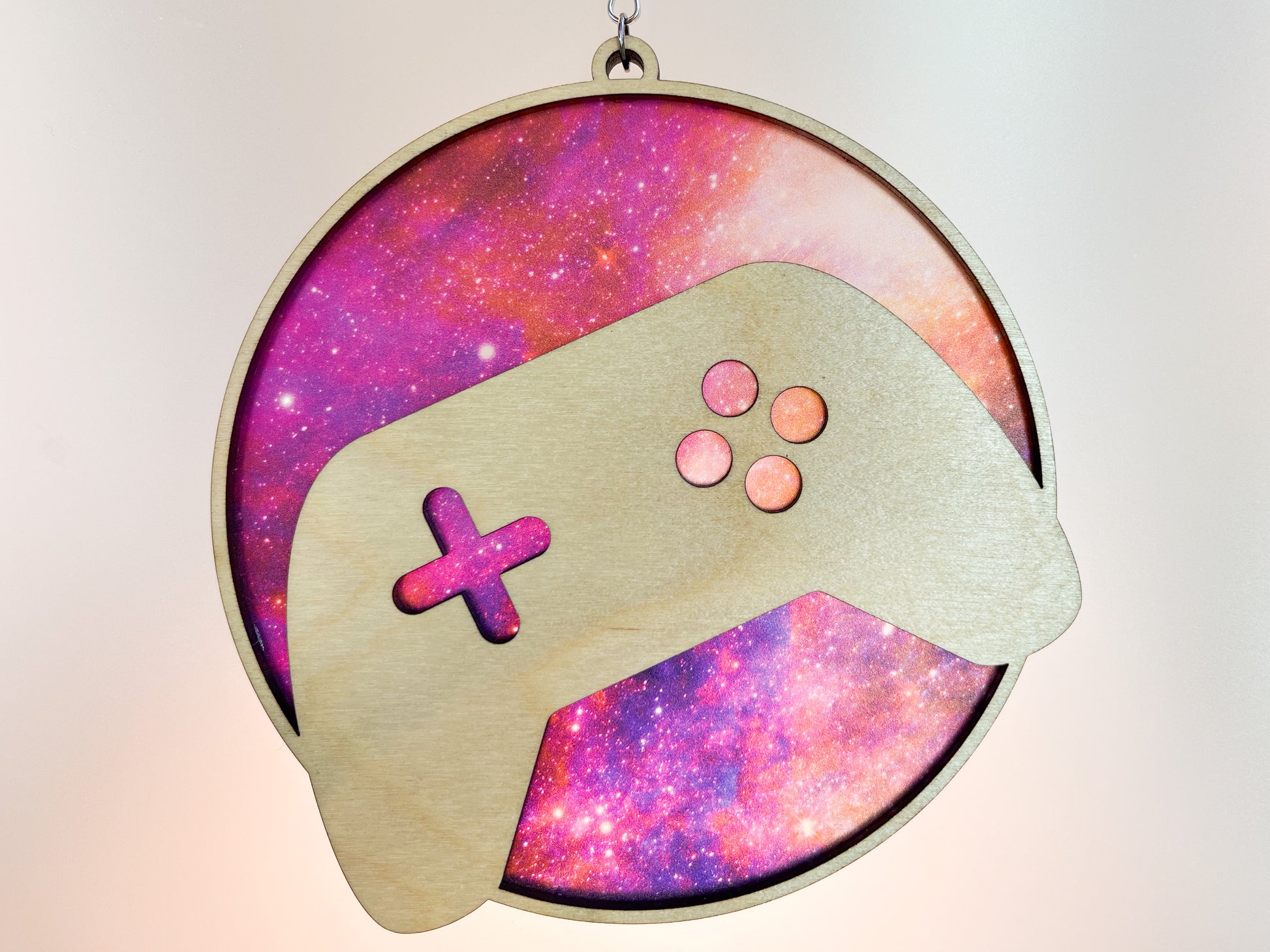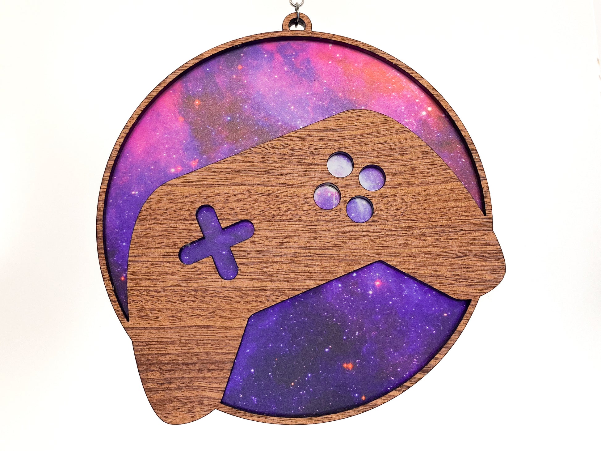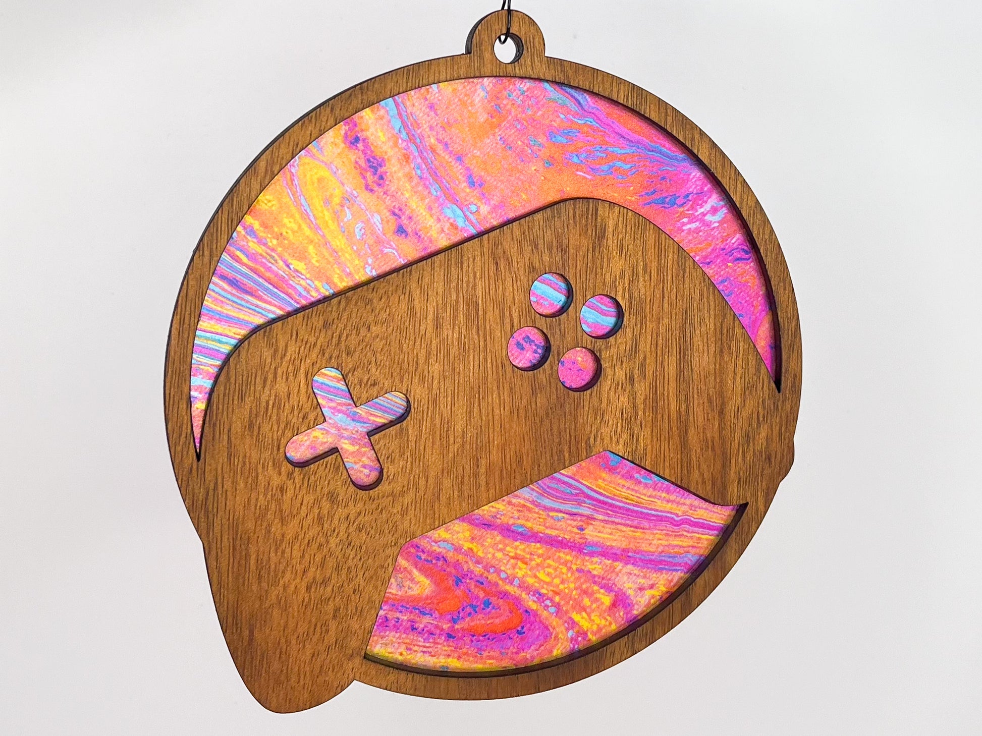 This suncatcher is attached to a swiveling hook, so it will spin easily in a light breeze. The background is made of a very thin acrylic, while the border and inset design is cut out of sapele (dark) or birch (light) plywood.