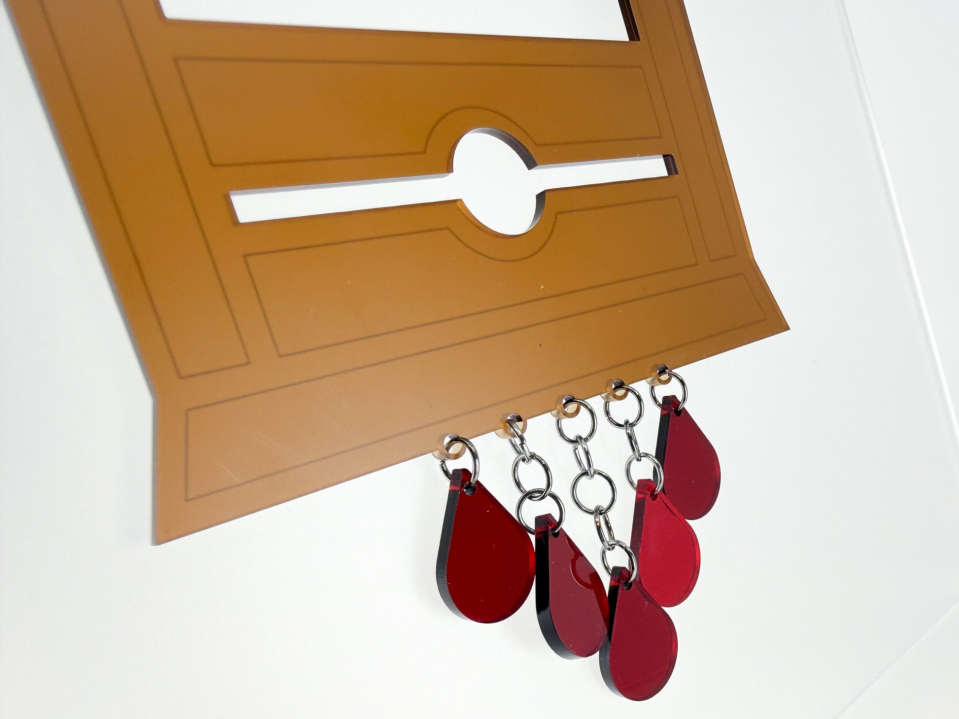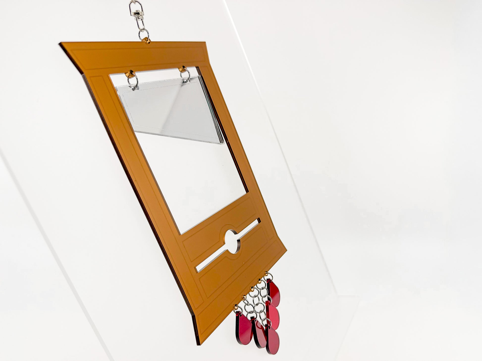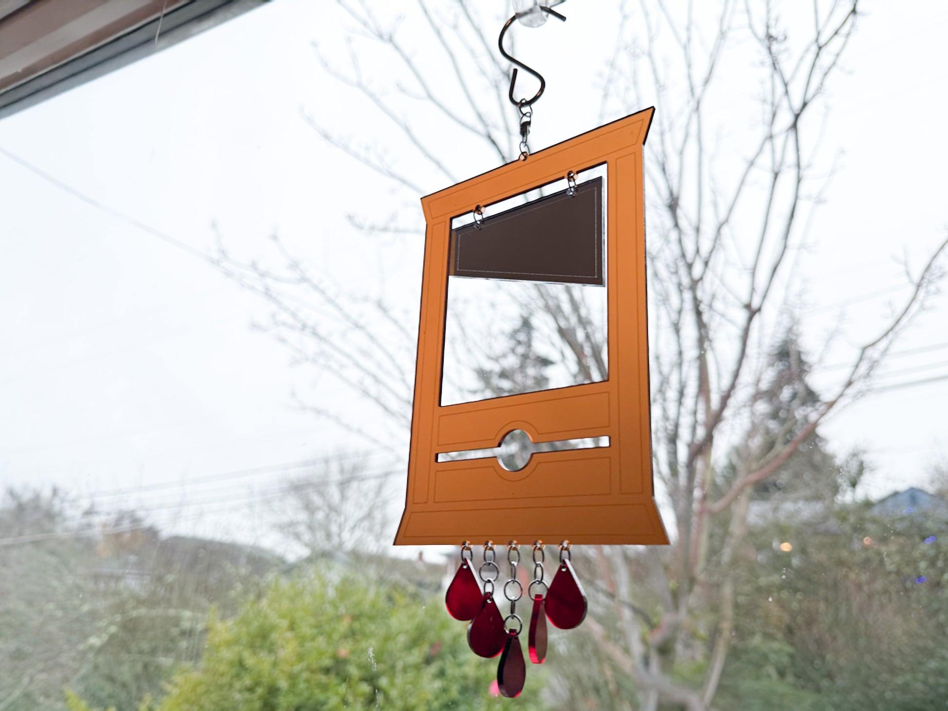 The guillotine suncatcher is attached to a swiveling hook, so it will spin easily in a light breeze. It is made of translucent acrylic, except for the blade, which is acrylic silver mirror on one side, and a gray coating on the other.