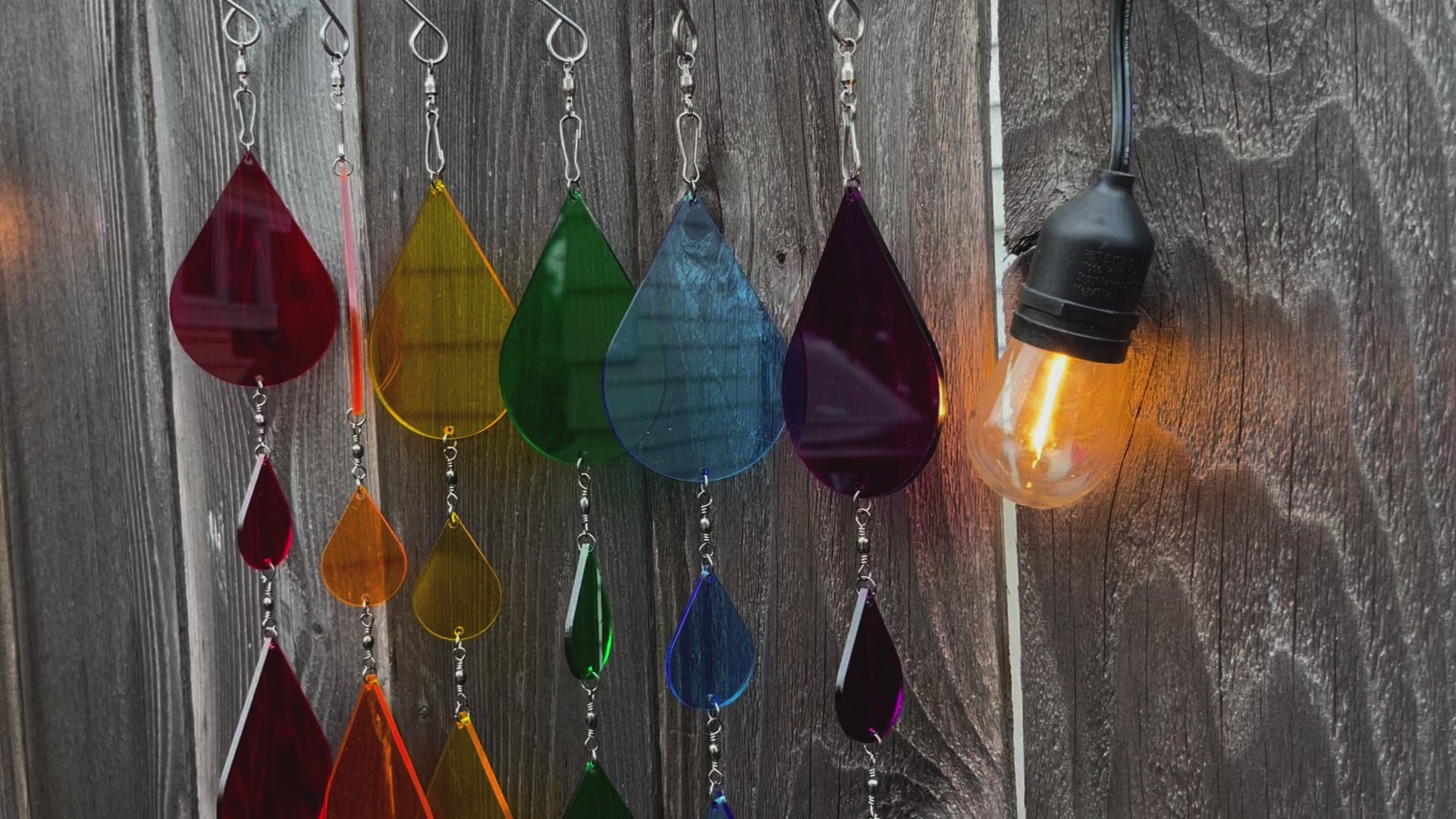Since I live in Seattle, I often take inspiration from an ever-present element: rain. These drops of colored sunshine catch the sunlight or lamp light and cheer up any corner of a room. Hang them from a hook on the ceiling or in front of a window and enjoy glimmers of color as they freely spin.