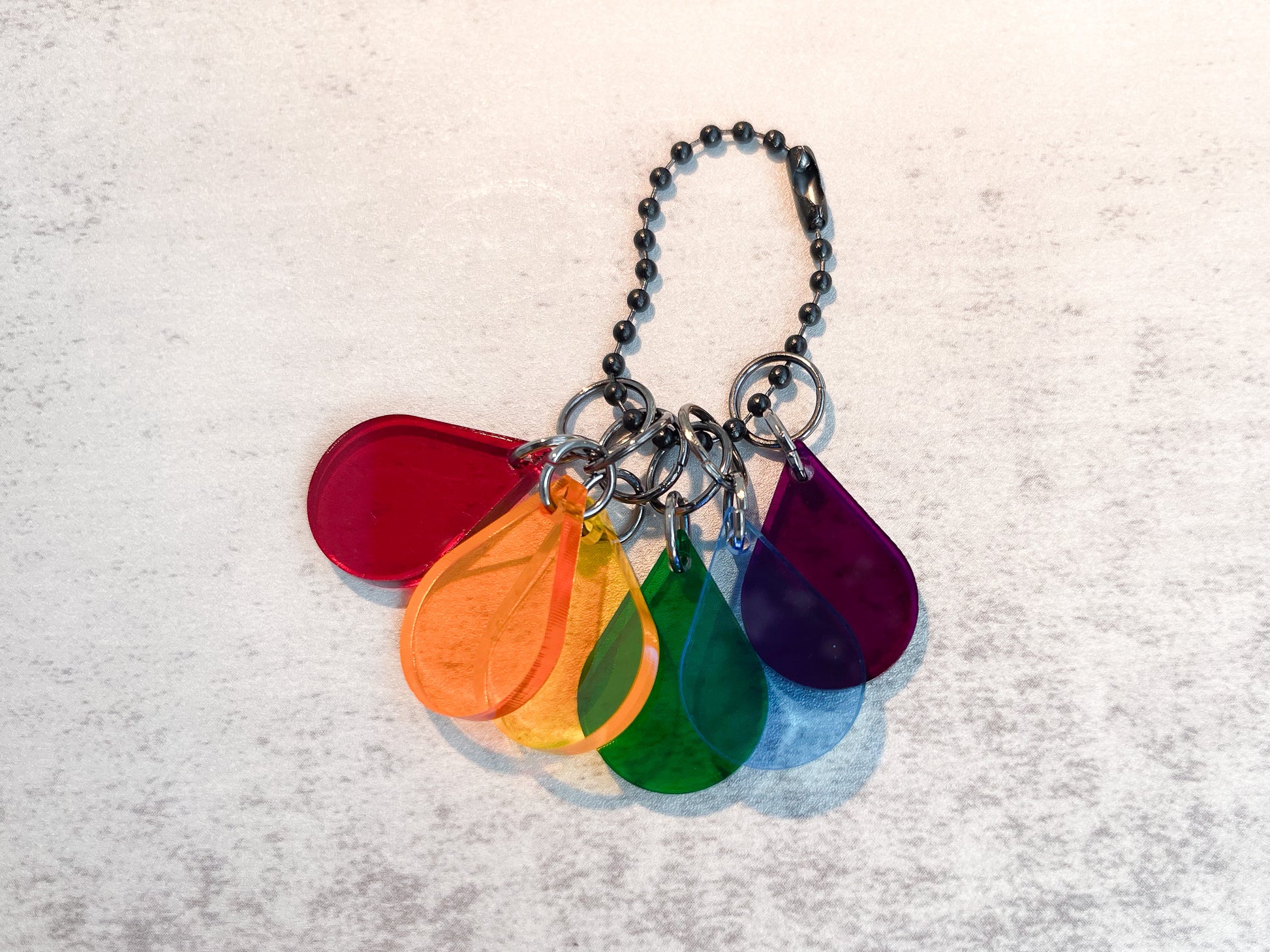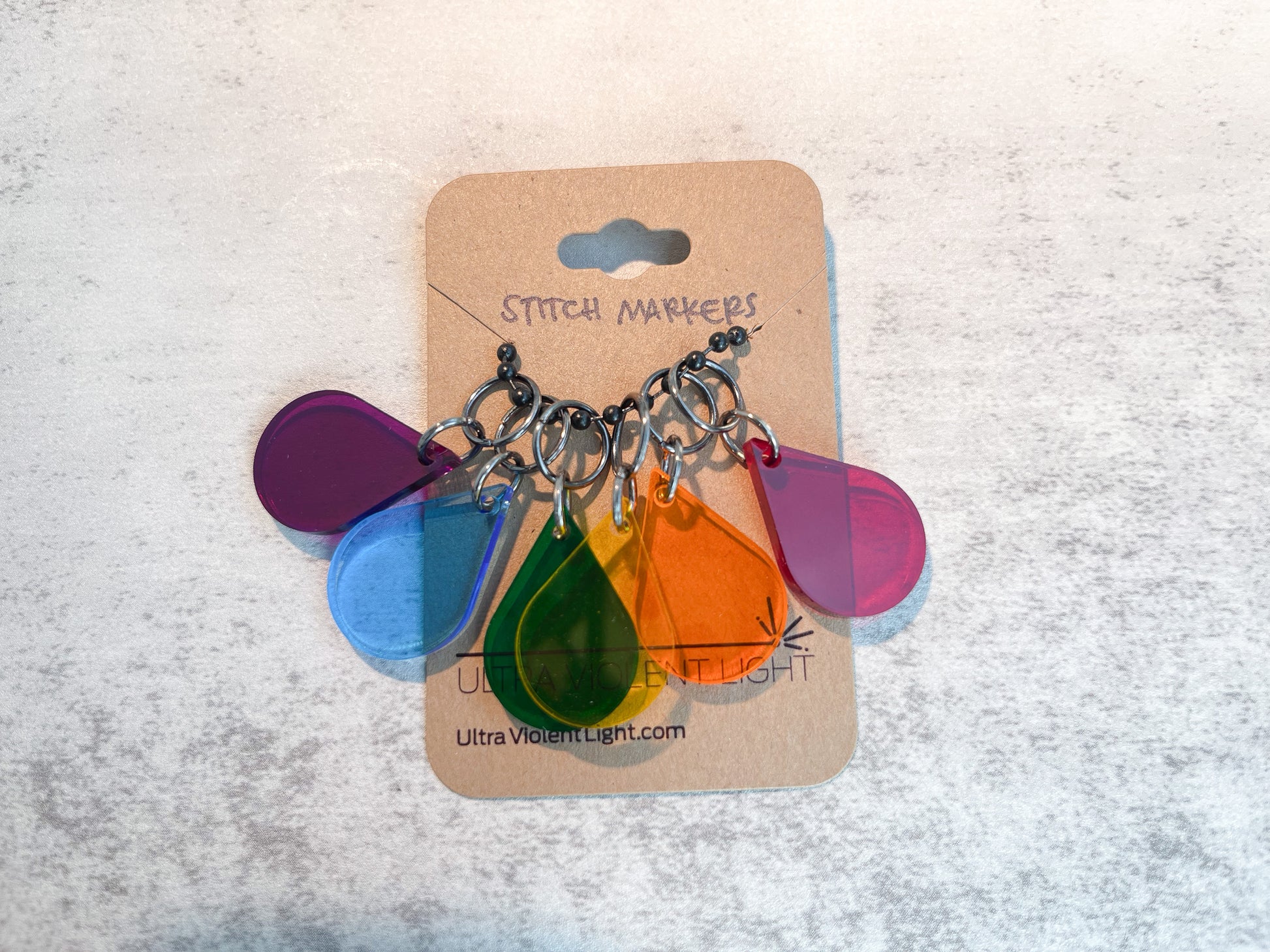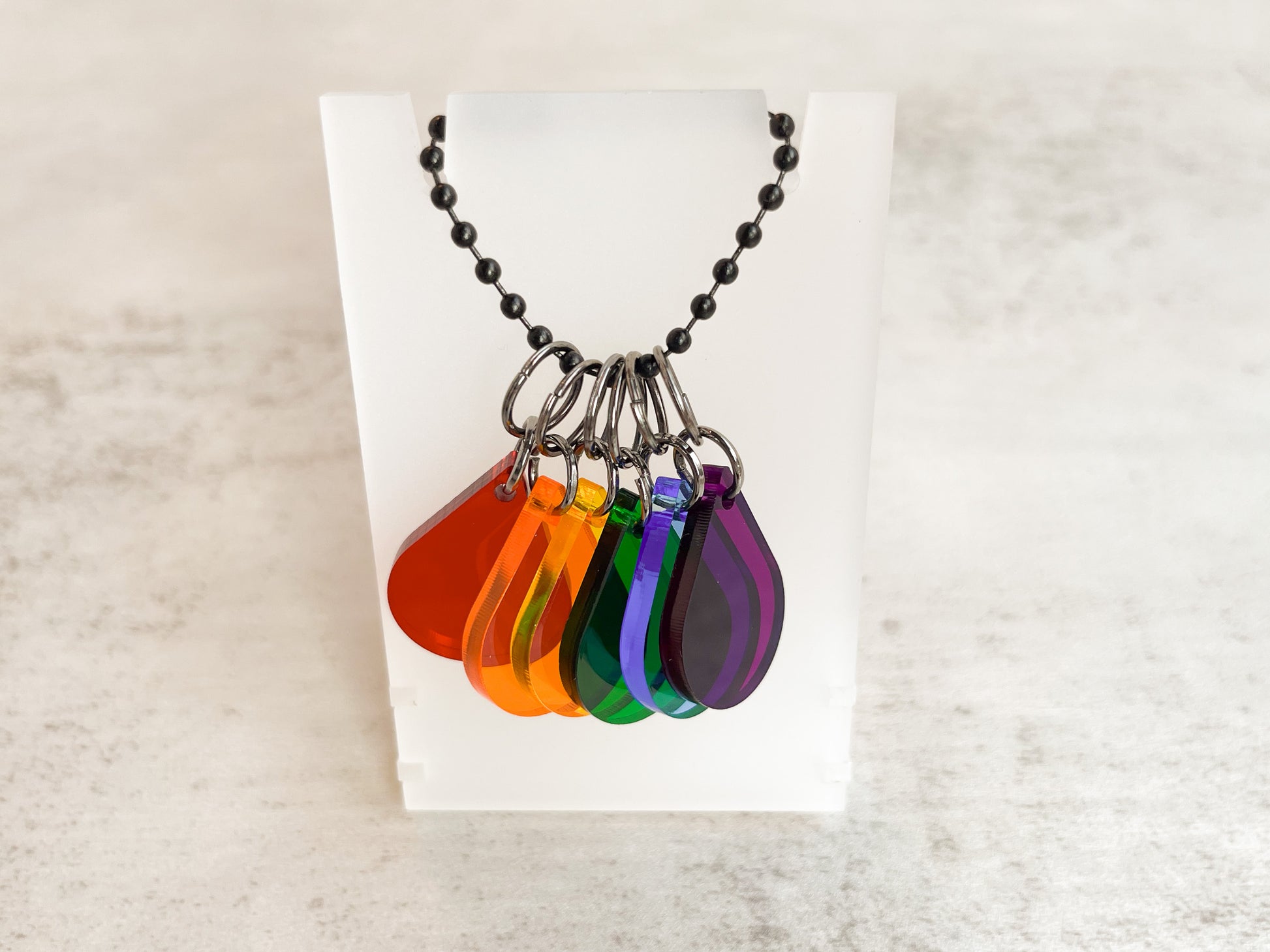 Add colorful flair to your knitting experience with Sundrop rainbow stitch markers. These six vibrant acrylic markers are perfect for easily keeping track of your stitches while making your project pop. (And they're pretty, uh, pretty, if I do say so myself.)