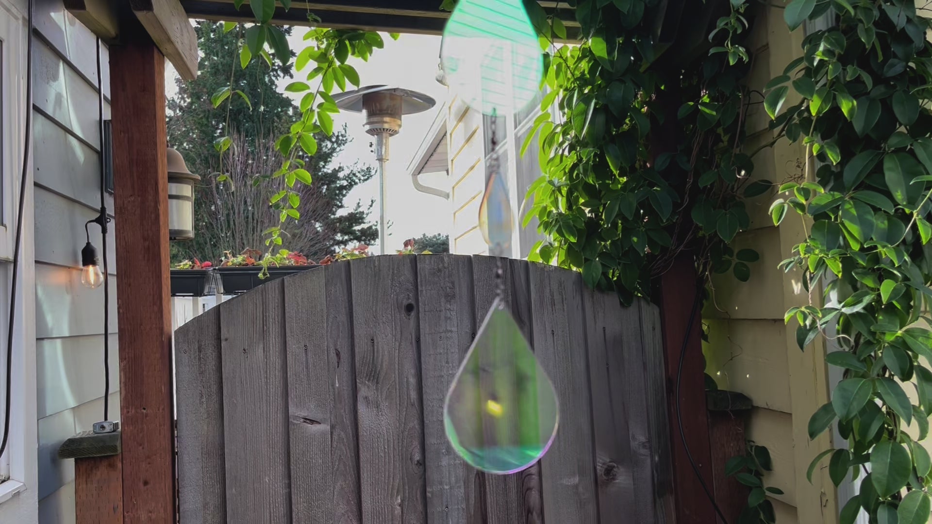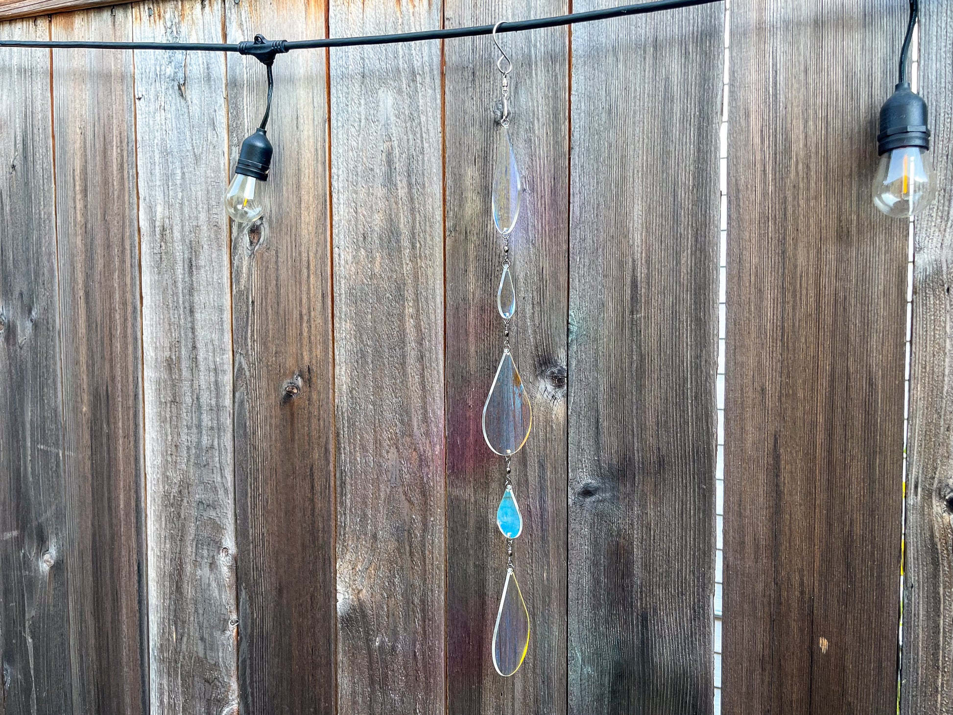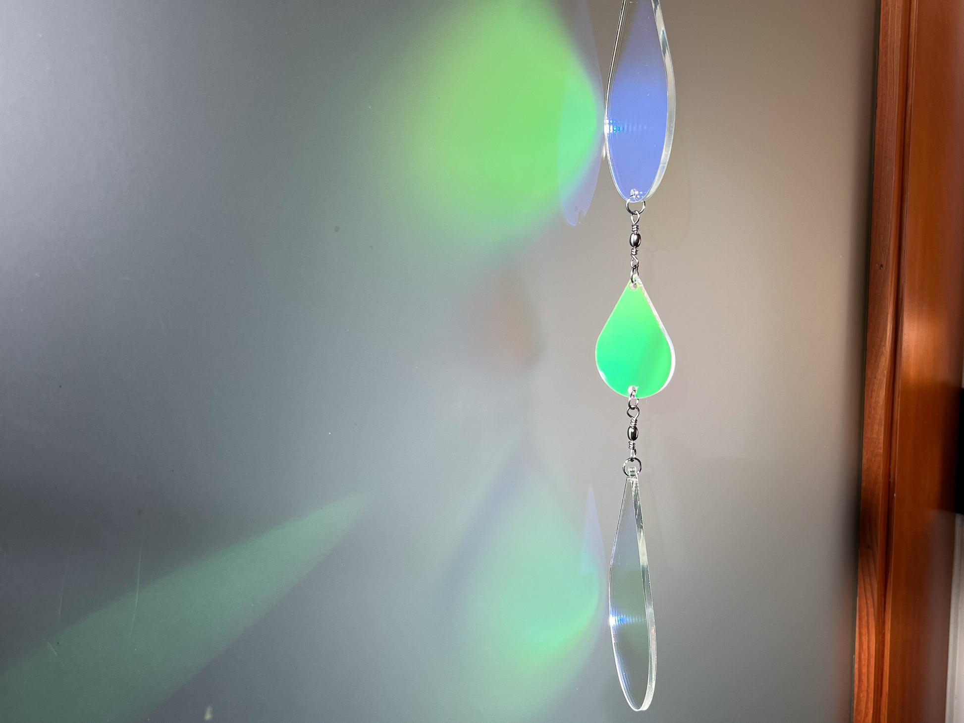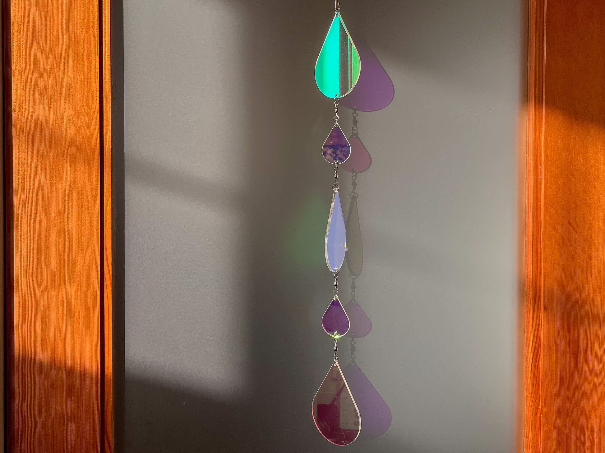 The acrylic in this sundrop has a film that makes it iridescent; casting reflections and shadows of colors from purple to coral to yellow, and many others. It varies depending on the light and the viewing angle, which makes it captivating. All of the photos in this listing are of the exact same suncatcher, just photographed with different angles and light sources!