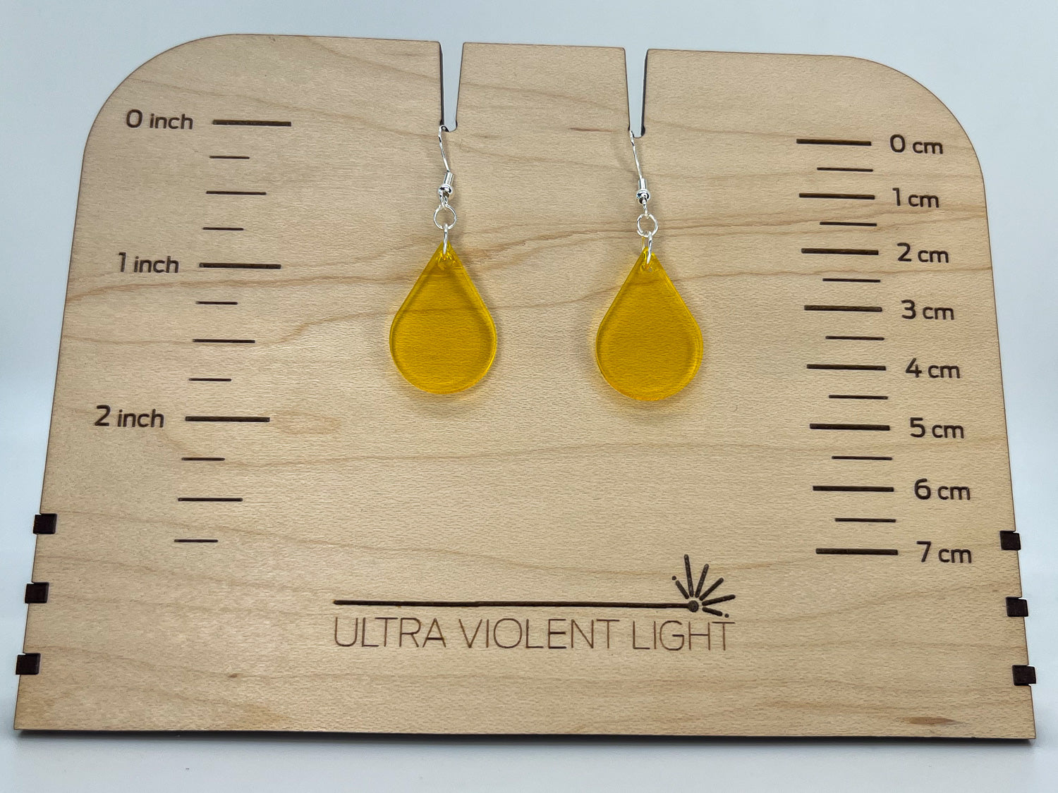 Translucent yellow sundrop shapes can hang from your ears! The earrings are about 1 3/4 inches long, made of acrylic. Ear hooks are silver plated, great for sensitive ears.